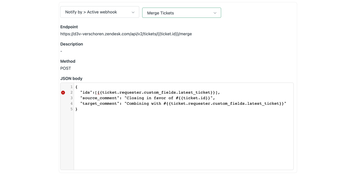 Here to, we need a webhook that calls api/v2/tickets/{{ticket.id}}/merge with a configuration like the screenshot below: