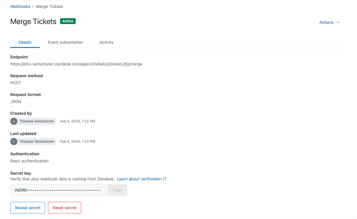 In this final step we'll wrap up our workflows and merge new tickets into existing tickets if they're available. First we need to create a webhook we can use to merge tickets. Similarly to the previous step, this is based on an earlier article on this blog: