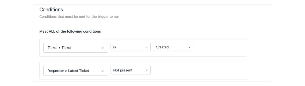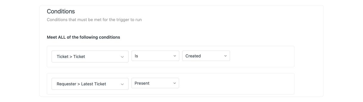 }Once setup this trigger will look at each created ticket and check if the value of Latest Ticket is blank. If blank, it'll update the user field with the ID of our current ticket.
