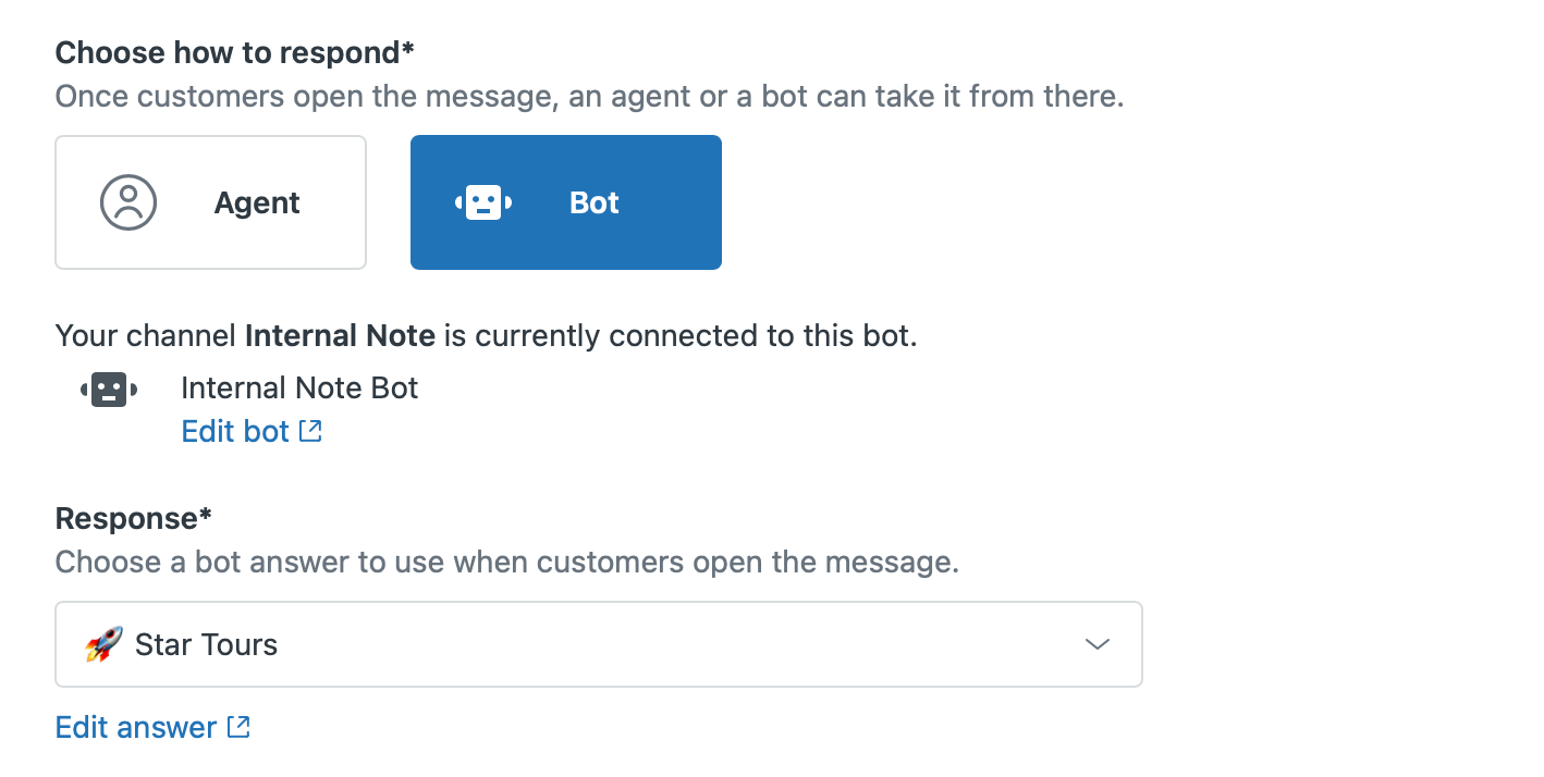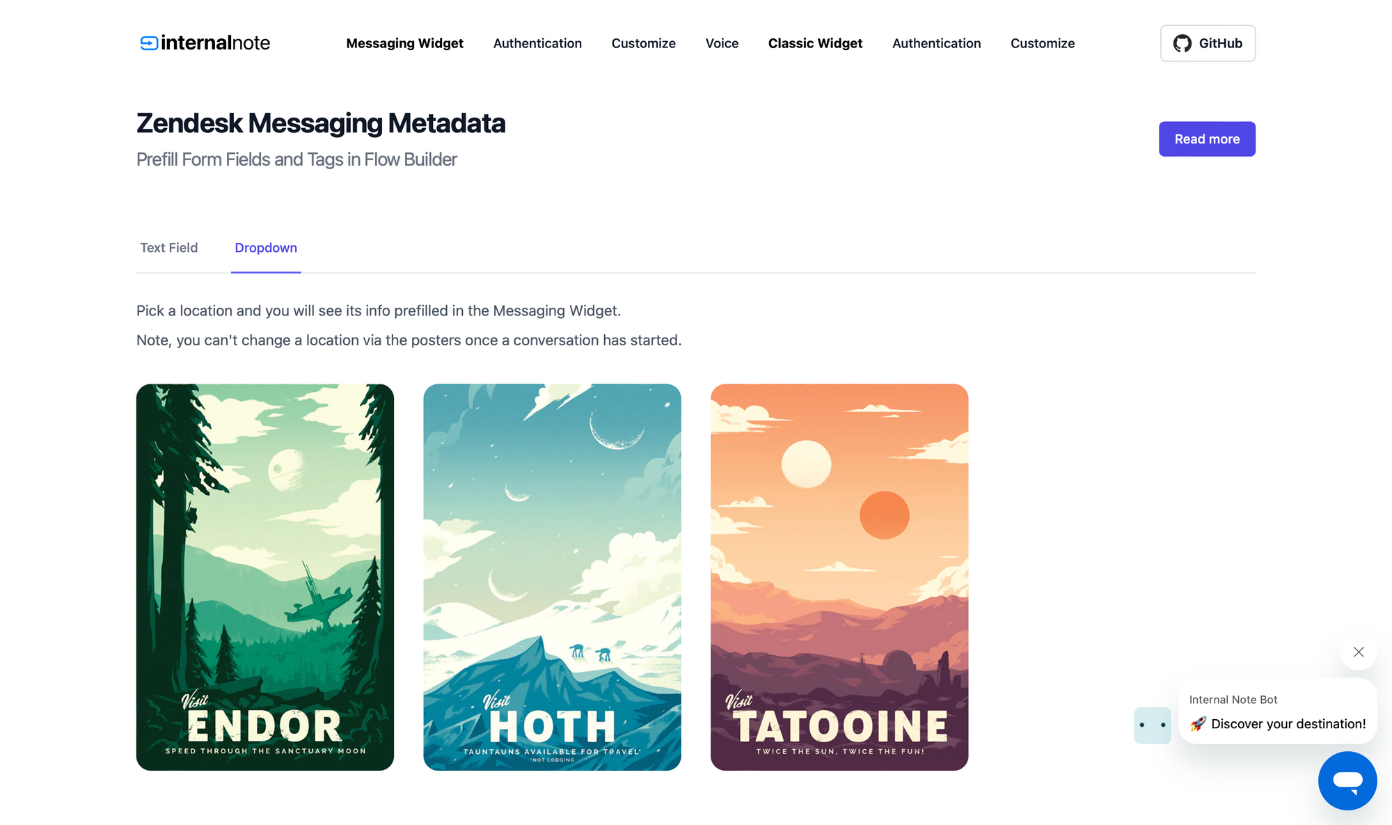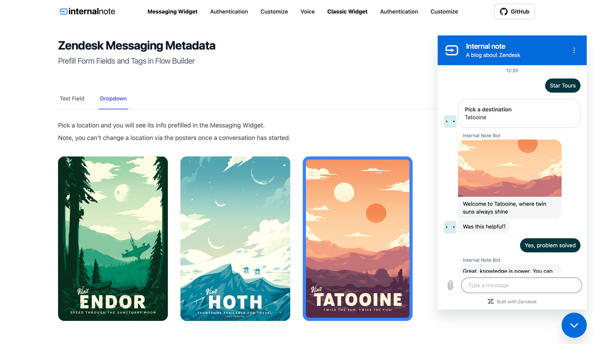 In this demo we show 3 holiday locations in a galaxy far, far away. When the user selects a destination we pre-fill the location in the messaging flow and when the customers interacts with the bot we'll use this value to branch to the right flow.