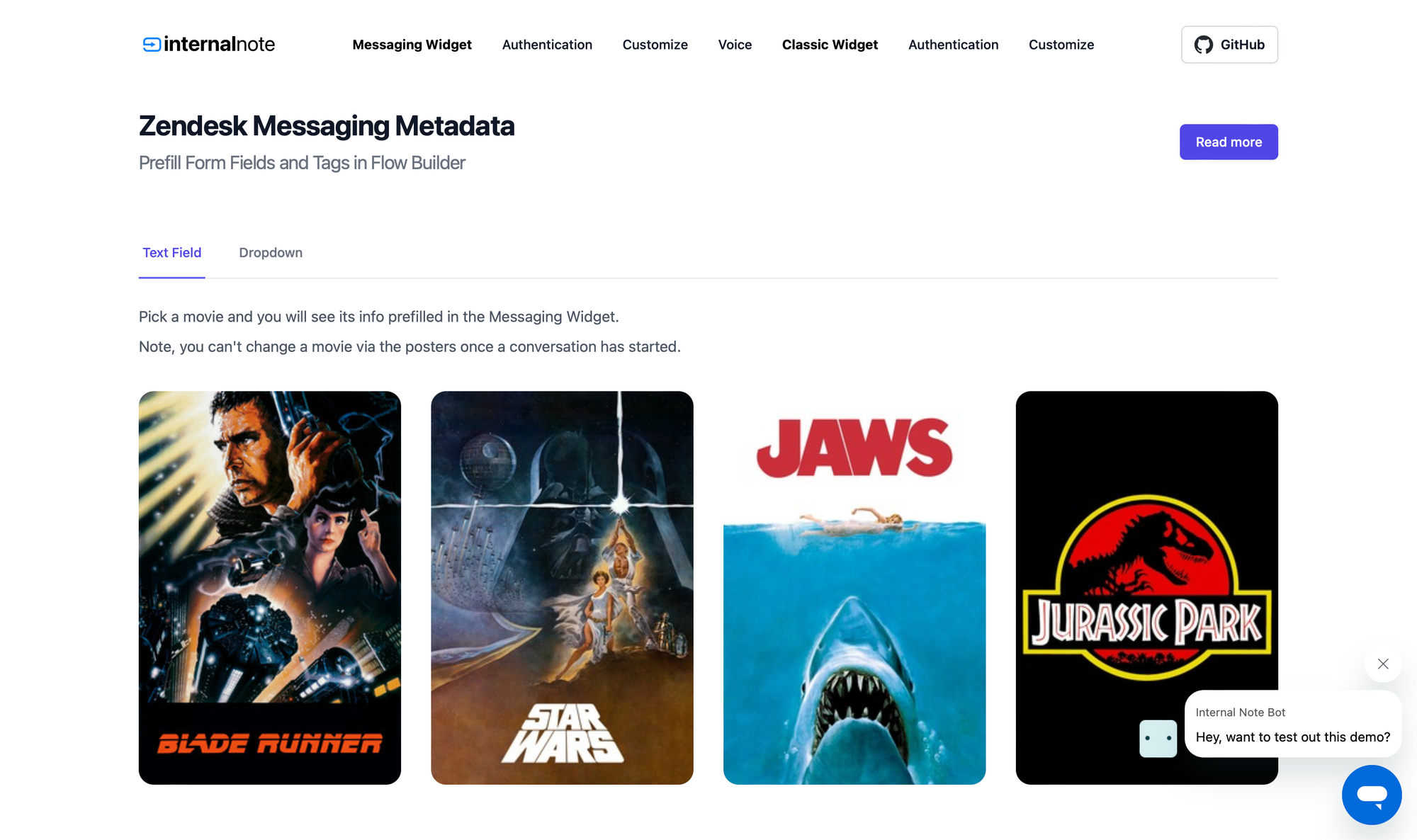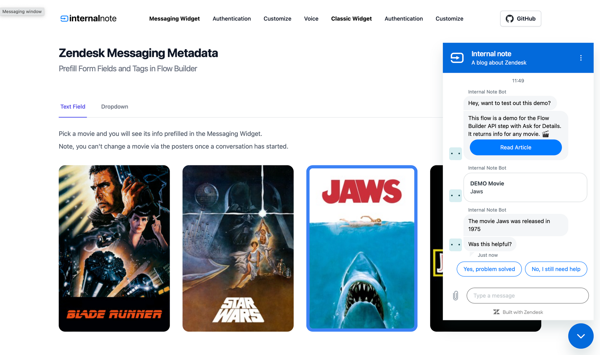 Now that we can pre-fill data in the Messaging Flow we can make this flow a bit nicer. We can e.g. show a list of movies on our website, and whenever the customer selects a movie we fill in the movie field with its title, and open the widget.