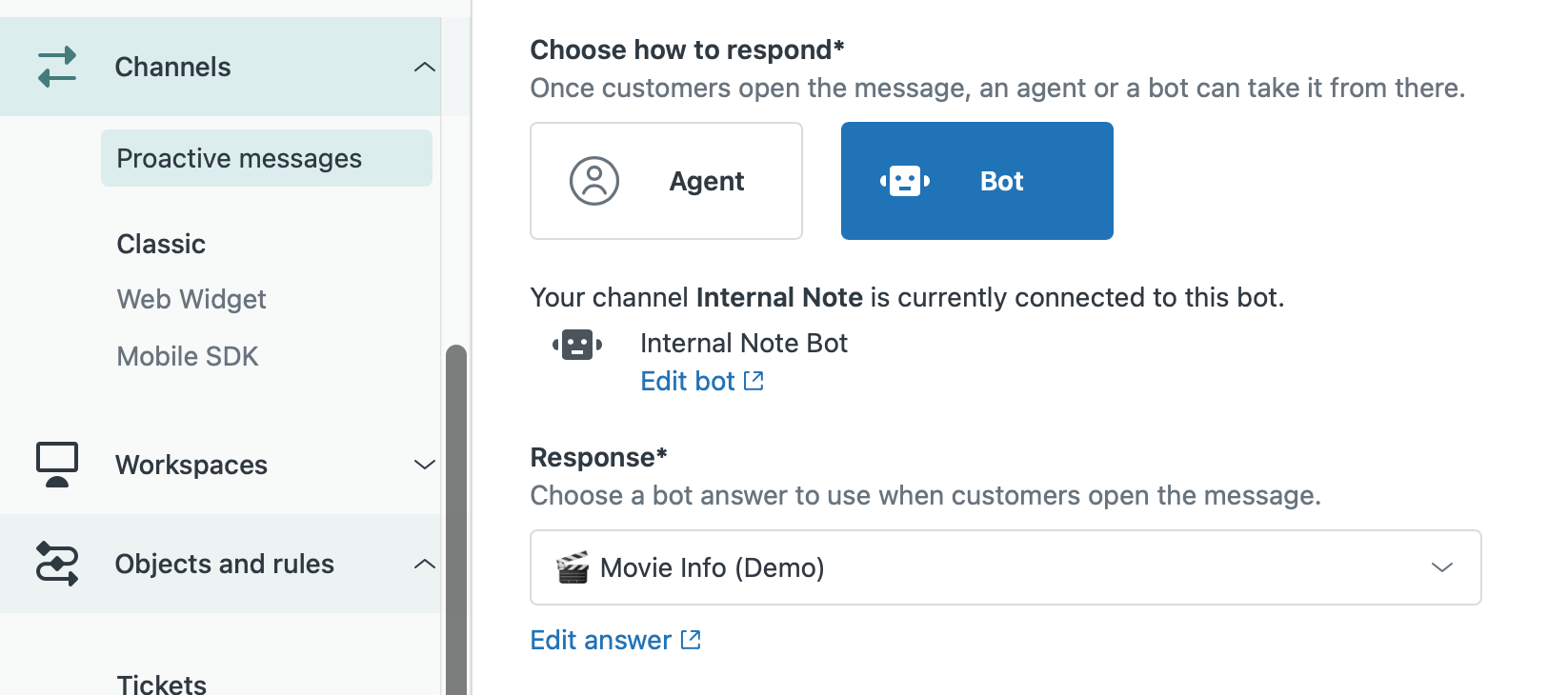 One extra I added to make the flow easier to discover is create a proactive message that preselects the 🎬 Movie Info intent in the Admin Center. This is an optional step but makes it easier for customers to discover the demo.
