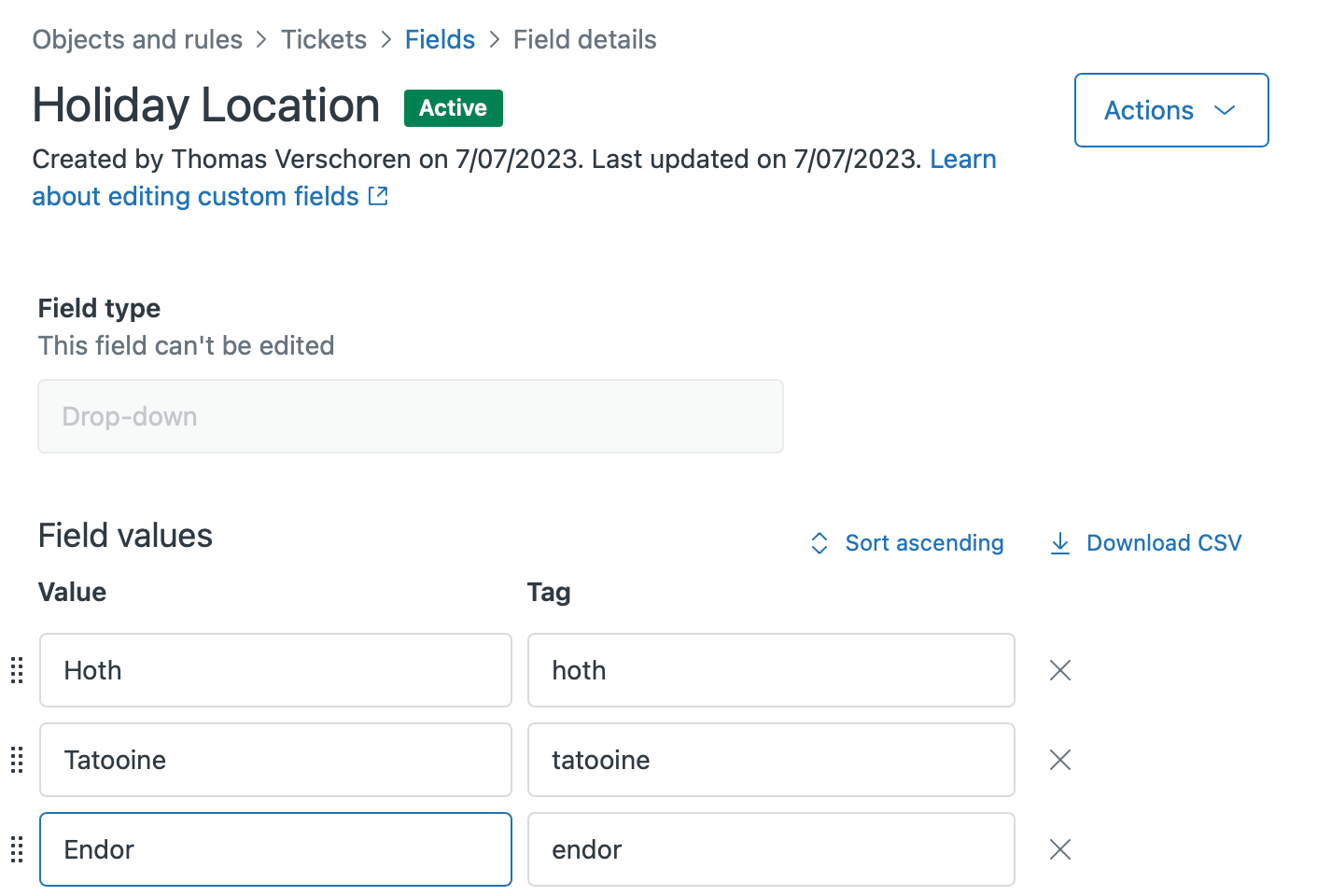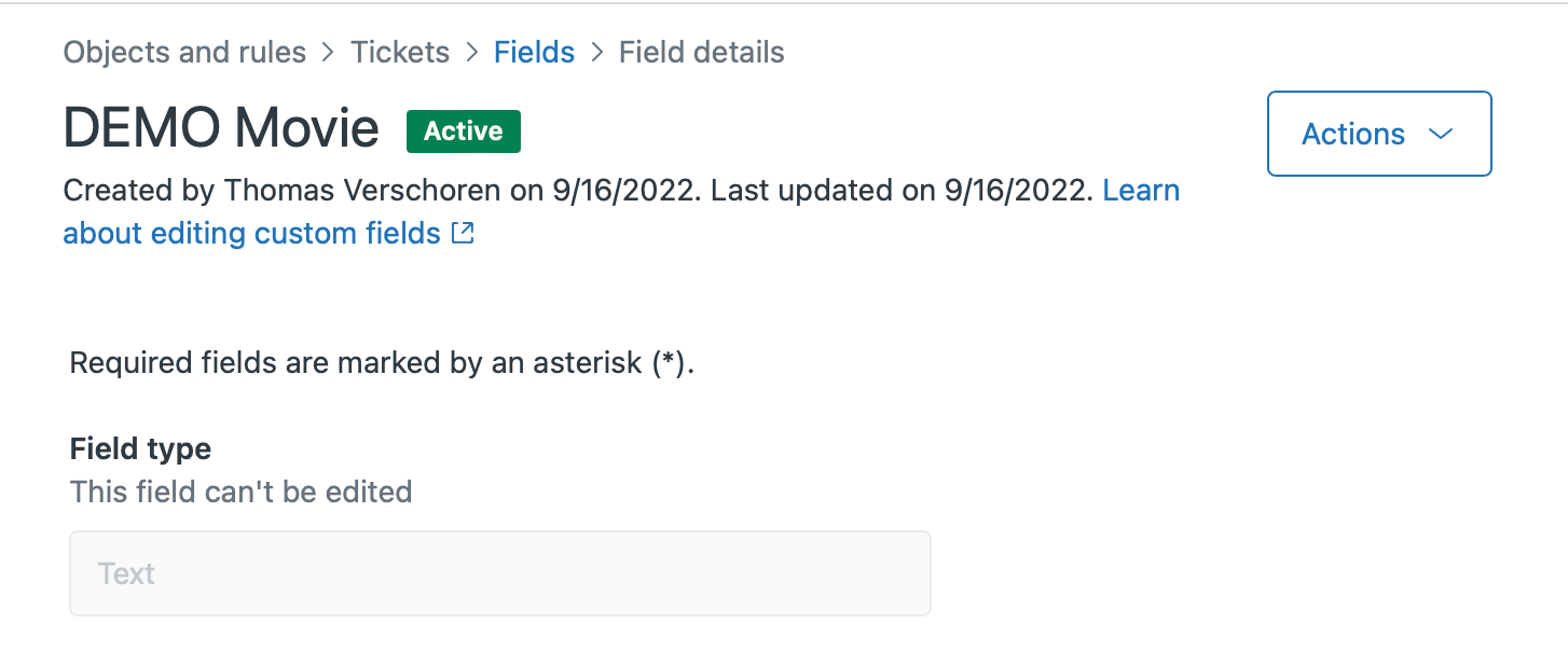 The first item you need for this flow is a ticket field to capture the Movie Title. Note down the Field ID which is part of the URL while editing the ticket field in the Admin Center: https://domain.zendesk.com/admin/objects-rules/tickets/ticket-fields/7662882404114