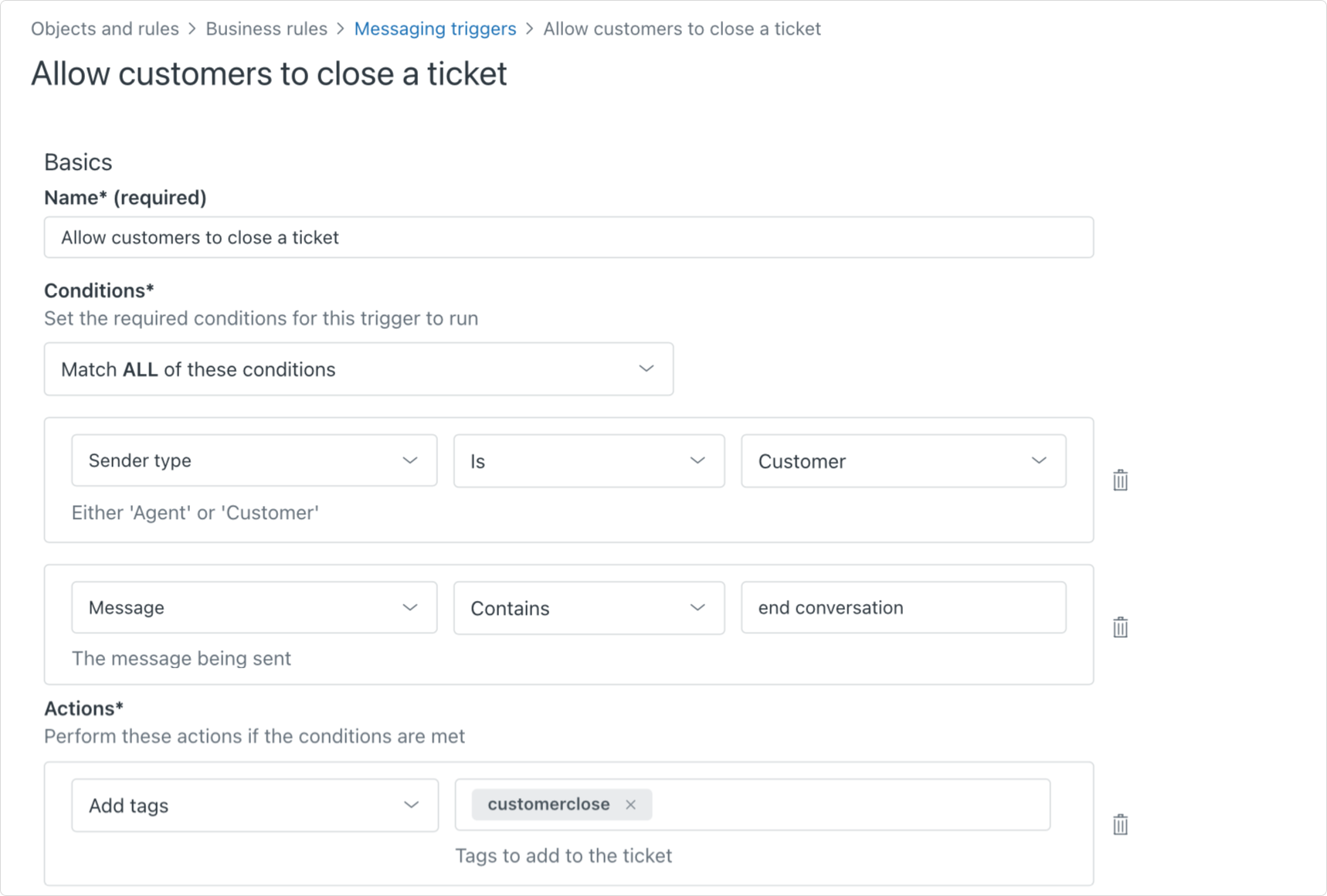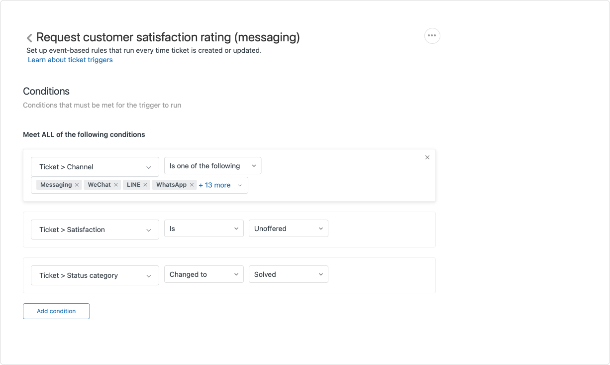 Doing the same for Messaging tickets however is tricky. Not every action you're used to do for email tickets can be replicated with the regular Zendesk triggers.
