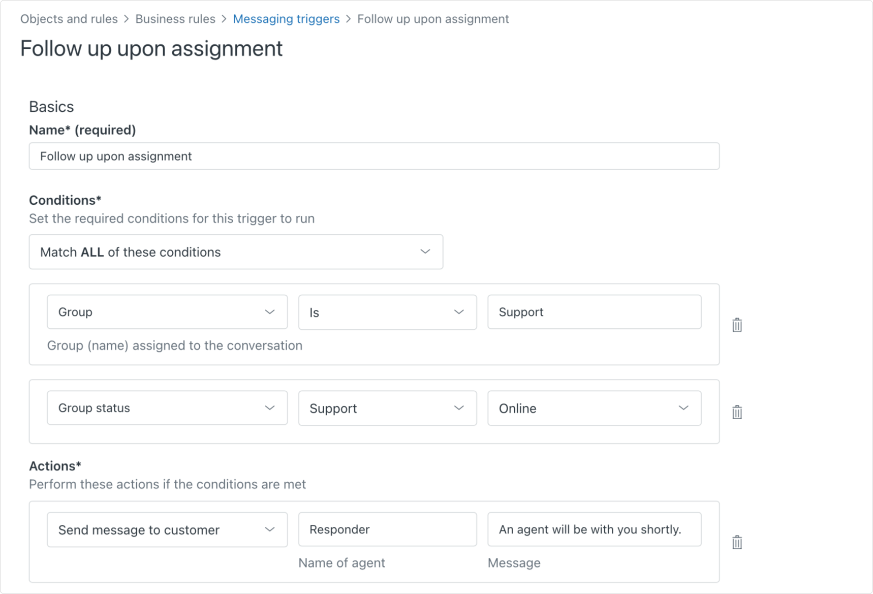 The above gives you a taste of what's possible with Messaging triggers. And when you dive into the options you can send messaging when tickets change groups, you can send reminders when a customer waits to long to respond, or you can tag tickets with specific keywords to change priority or routing.
