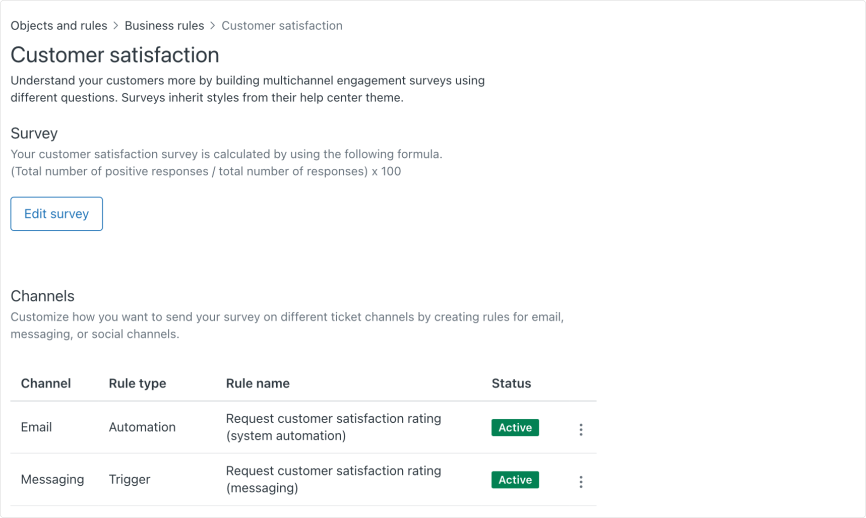 Setting up Customer satisfaction for Messaging happens within the new Customer satisfaction Business rules section of the Admin Center.