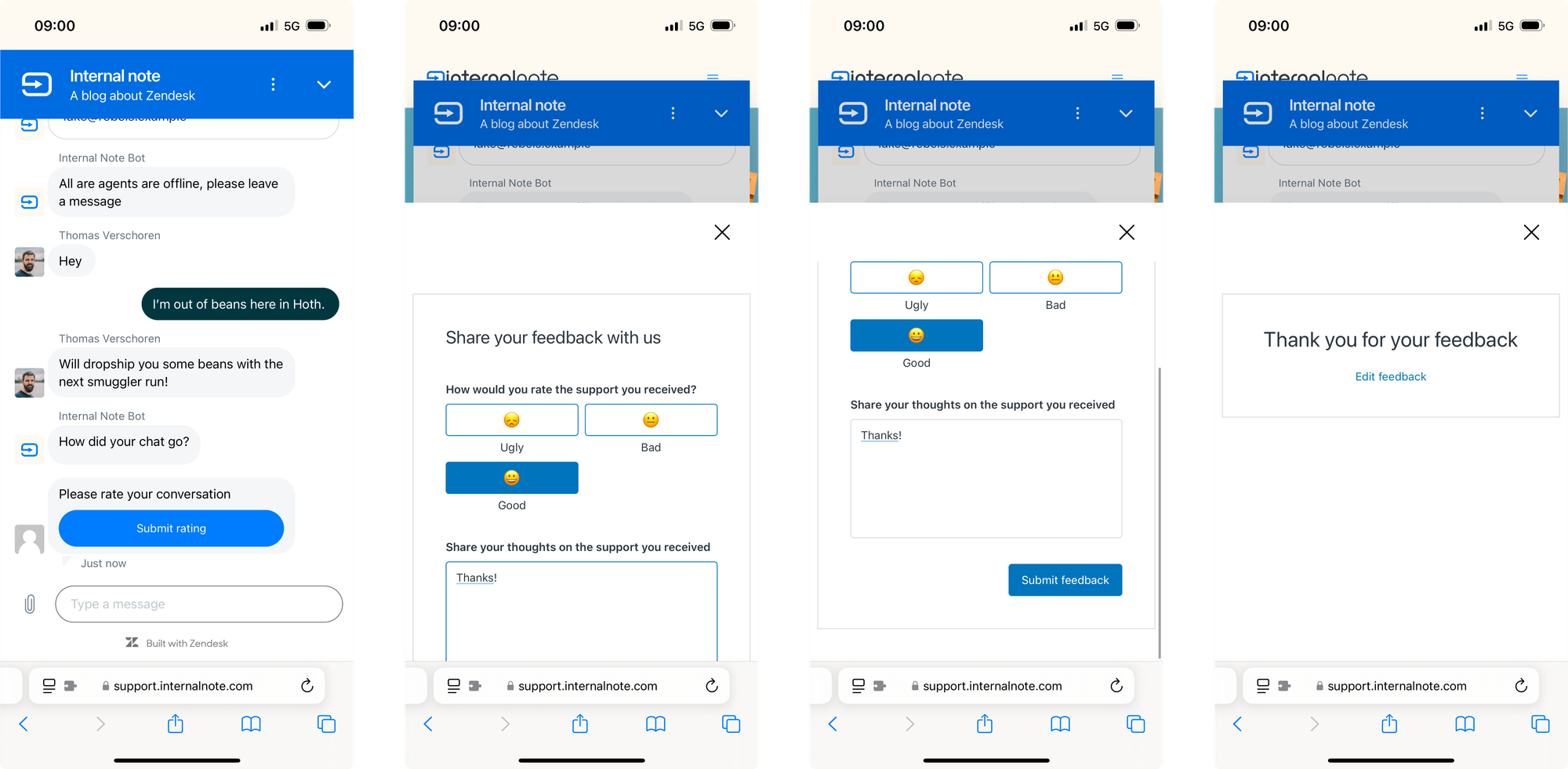 For customers this integrates nicely with the existing Messaging flows as a new modal view that pops up within the Zendesk Widget. When triggered in social channels this can either popup as a similar modal if supported, or will show a button that links to a webpage to leave their feedback in a similar layout.