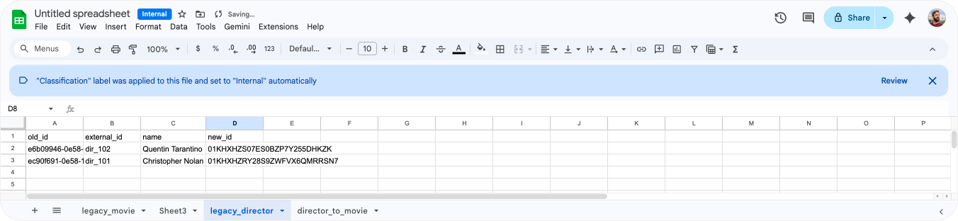 Now that we have a new id for each director, we can use that to enrich our relationship file. In our relationship tab, add a new column enter the following function =VLOOKUP(B2, legacy_director!$A:$D, 4, FALSE). This function takes the ID of the director in the old object (column B), lookup the new ID for that director in the old director sheet, and outputs the new ID of the director in column D.