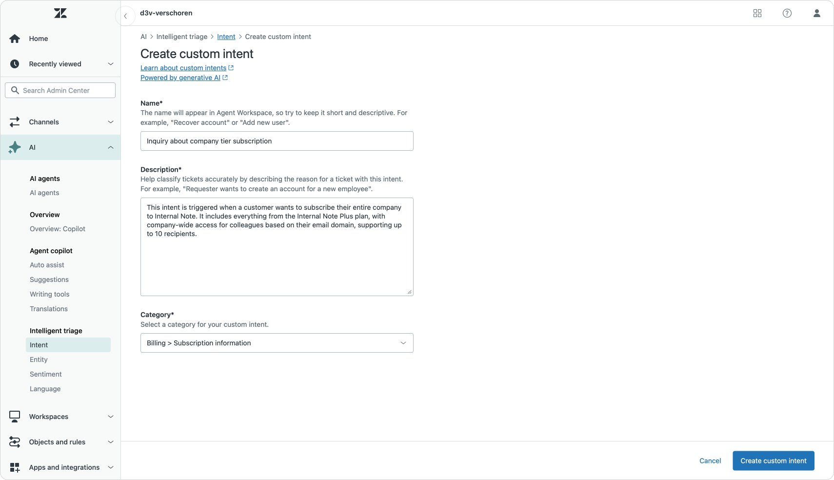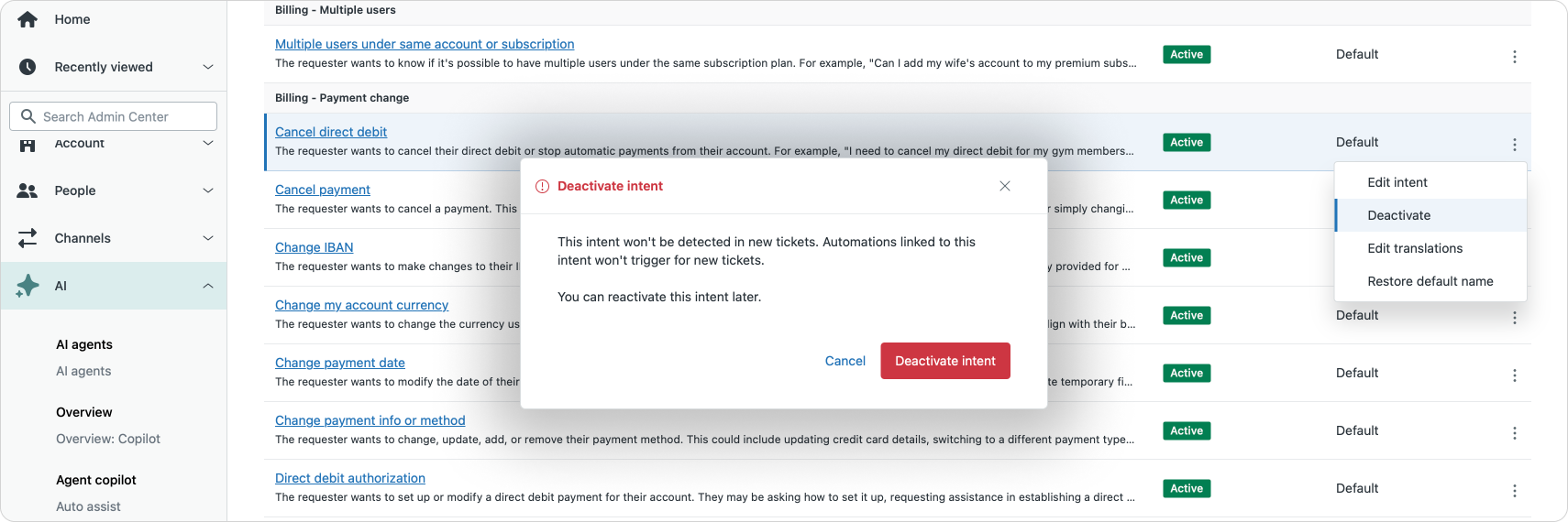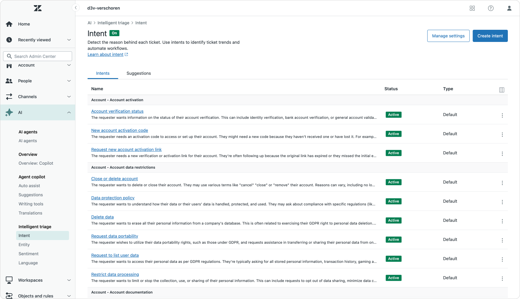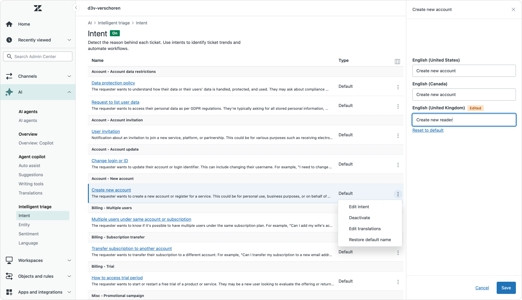 To make it clear to your team what a ticket is about, you should go over the existing Zendesk intents and rename them to match your company's vocabulary.