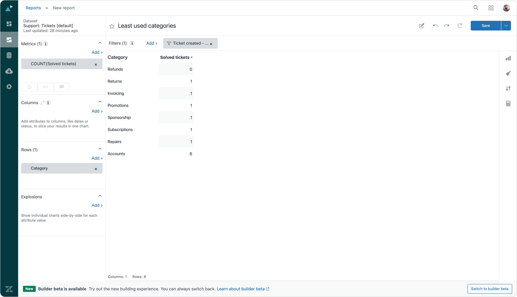 This will give you a list of categories in one column, with a second column of intents right next to it. In a perfect scenario those two column should have almost identical values. Where your agents categorize something as "Refund", the system should also associate a "Refund" intent with those tickets.