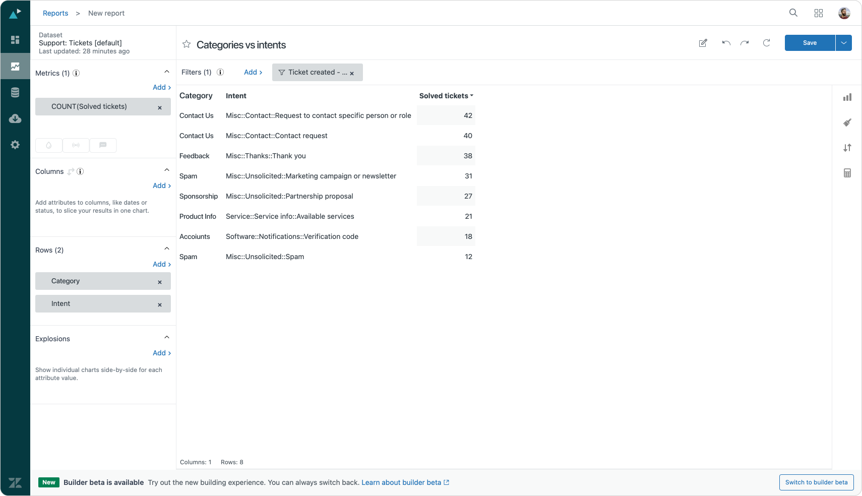 Within Analytics you can then create a new report that looks at all tickets of the last two weeks. Create a table with two rows. One is your category field. The other the system Intent Field.