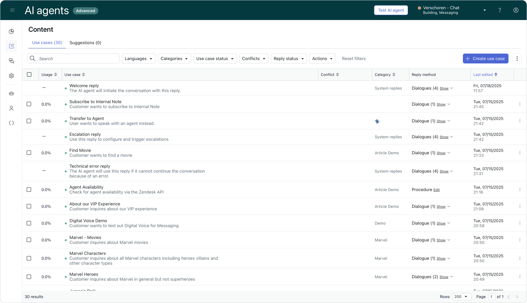 As you go over the list and modify intents, you'll get closer and closer to a table that is as perfect as possible. Once you're happy with the results you can be sure that Intents in Zendesk will work as well, or better, than your categories.