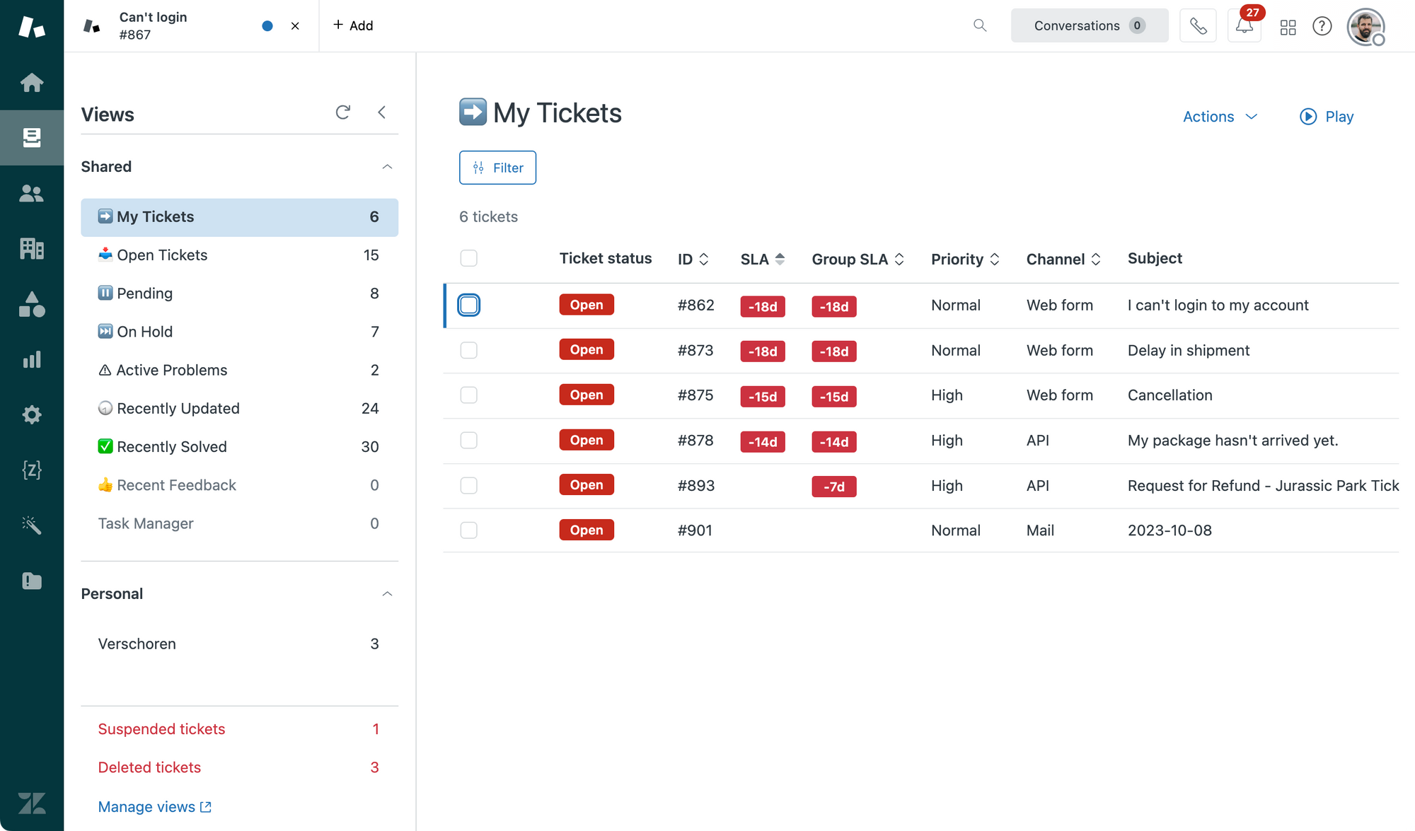 - The ticket appears in an "Open Tickets" view for agents that contains all new and open sorted by SLA, so the first SLA to breach is top.