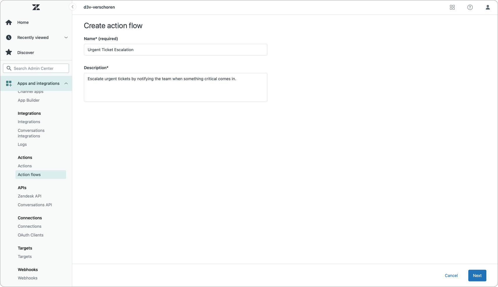 Creating an Action Flow is quite similar to how you would approach creating a Flow Builder flow in the classic Zendesk Bot. You start with giving your Action Flow a name and description.