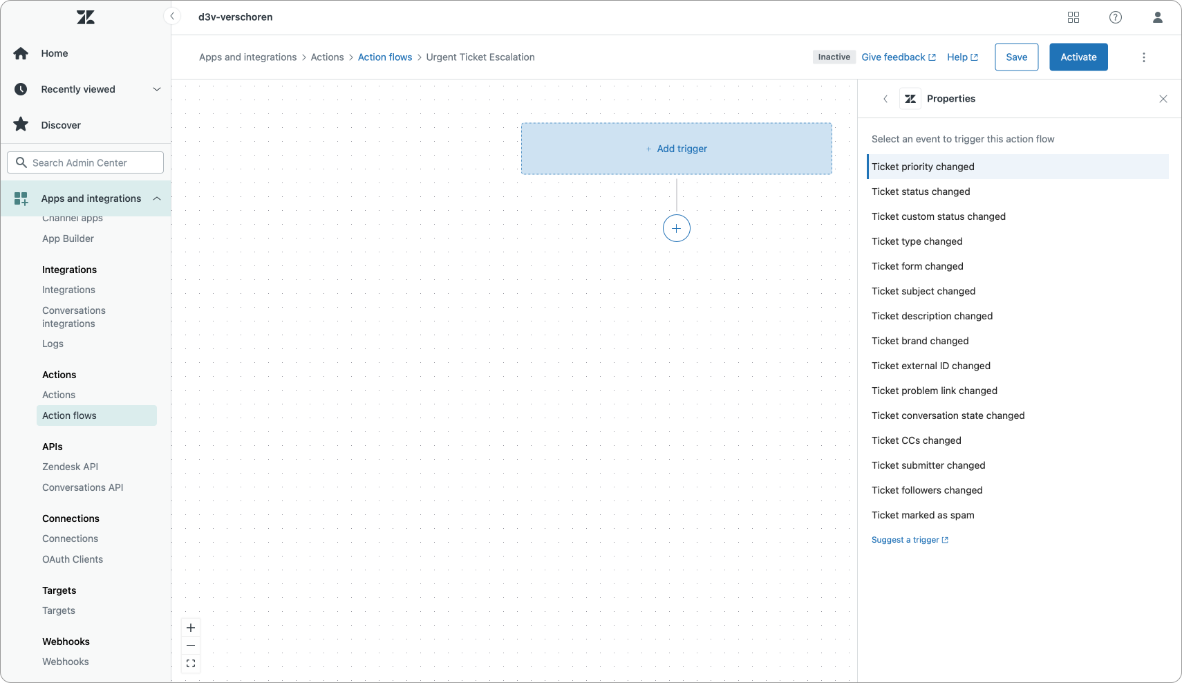 In our flow we start with a Trigger that reacts to Ticket priority changed.