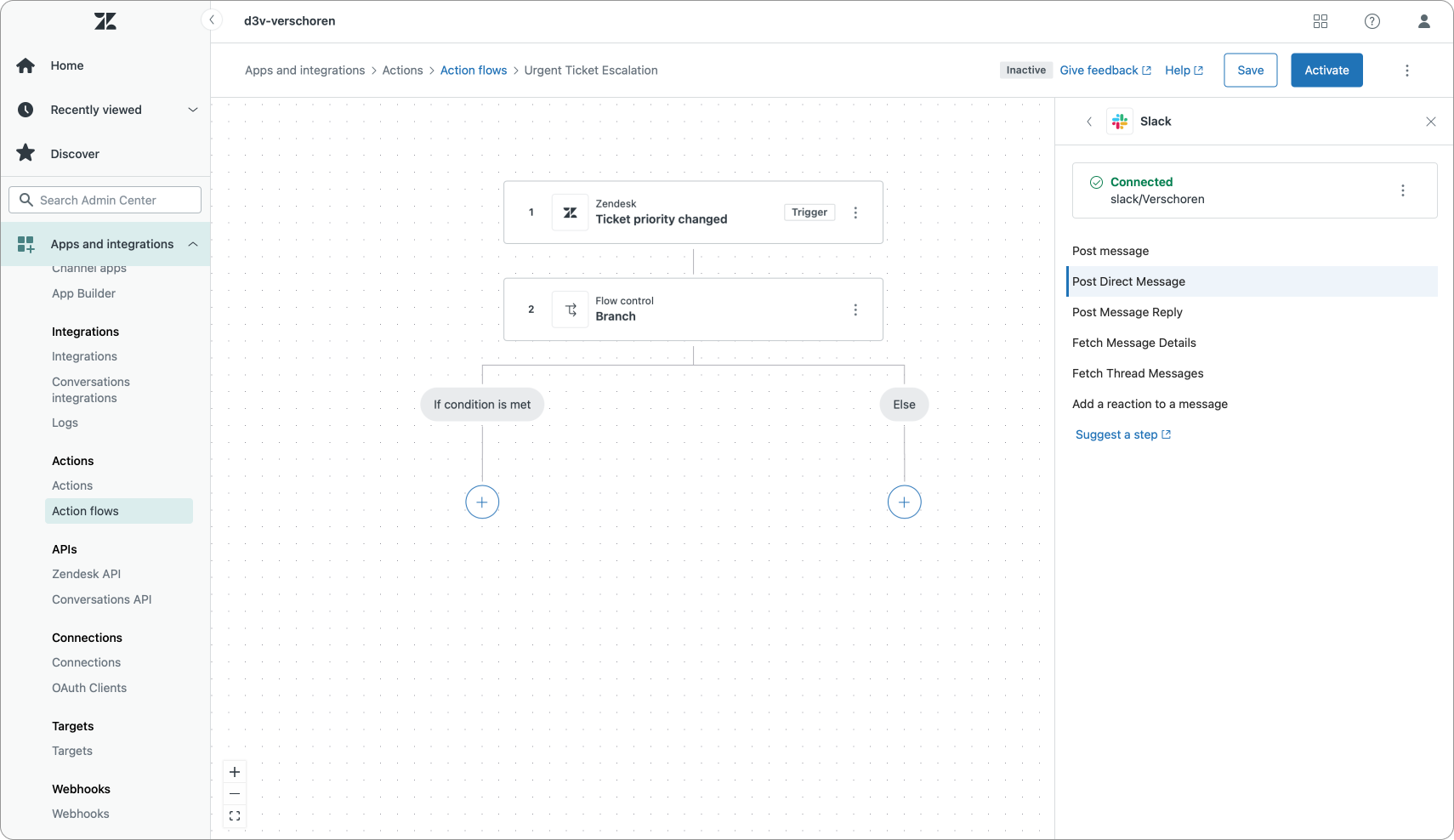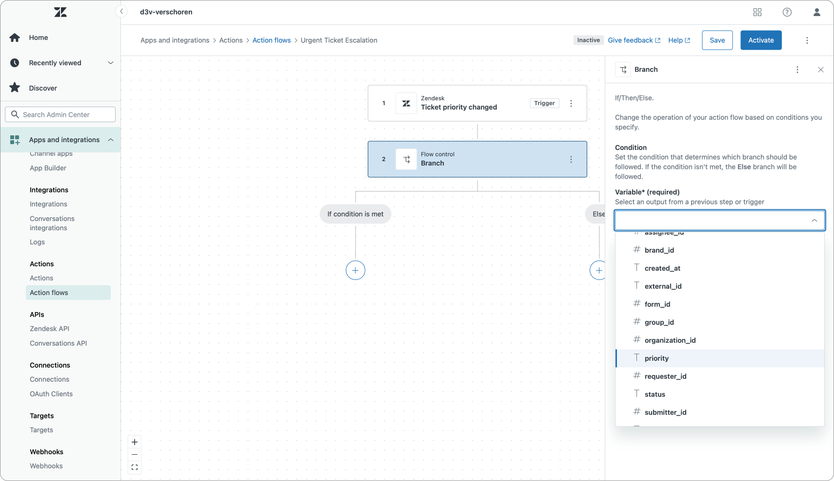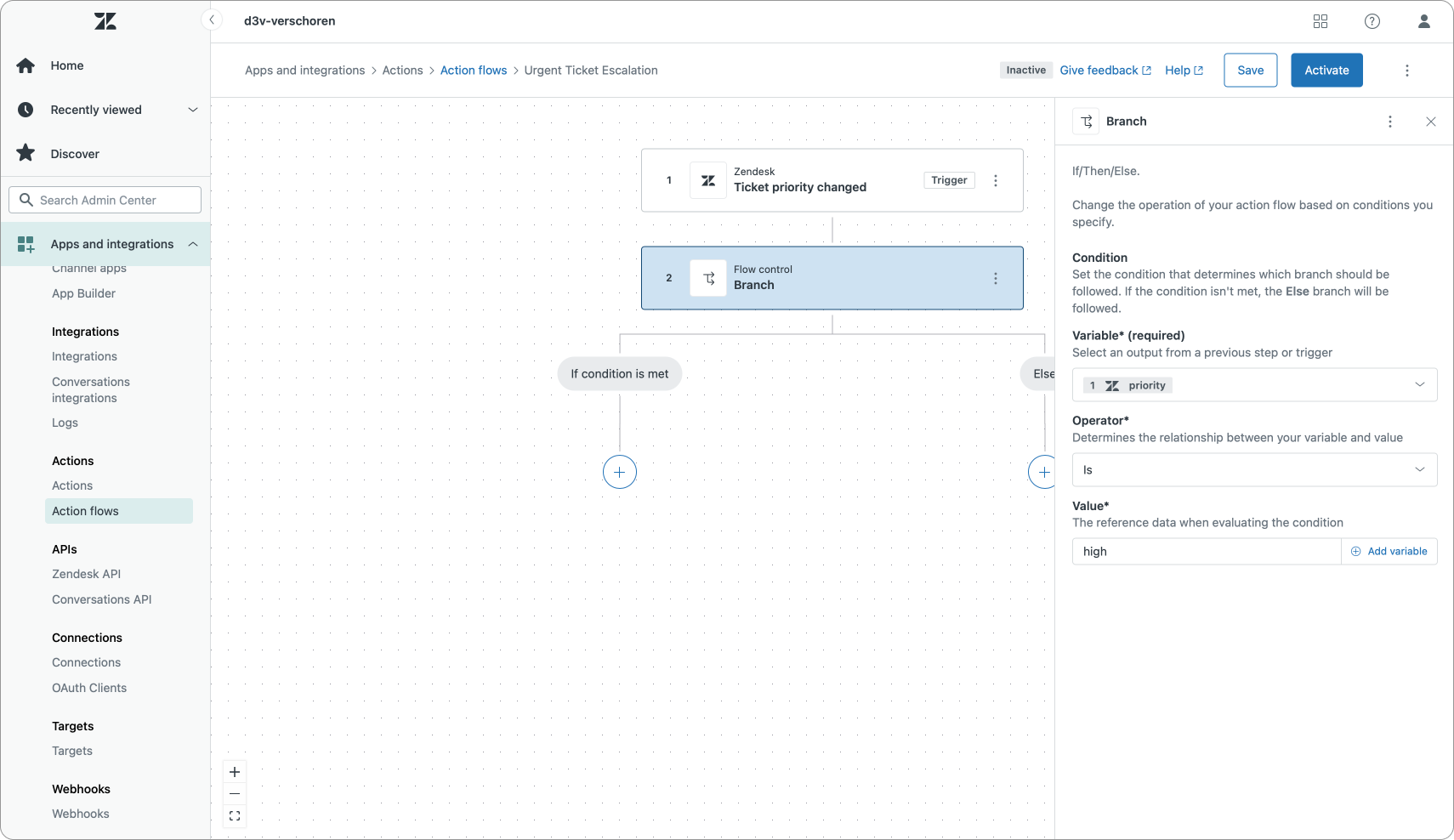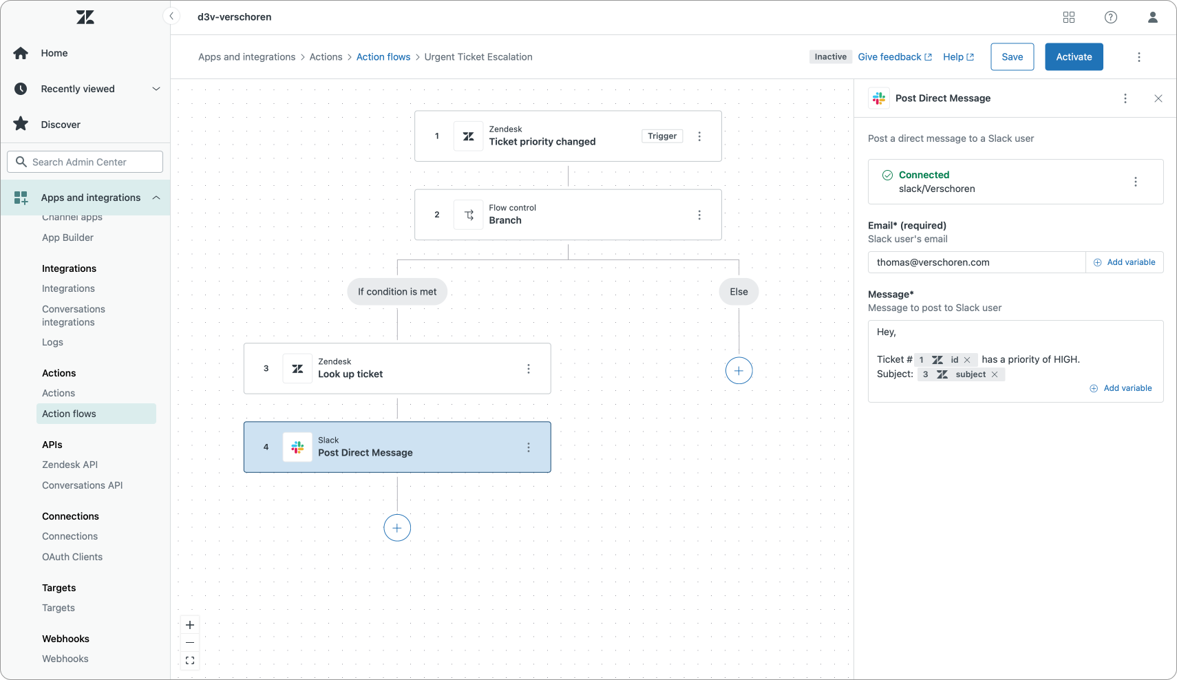 This first flow is a basic example of an Action Flow that reacts to tickets where the priority changes. If we detect an urgent priority we want to notify our team in Slack to take a look at the ticket.