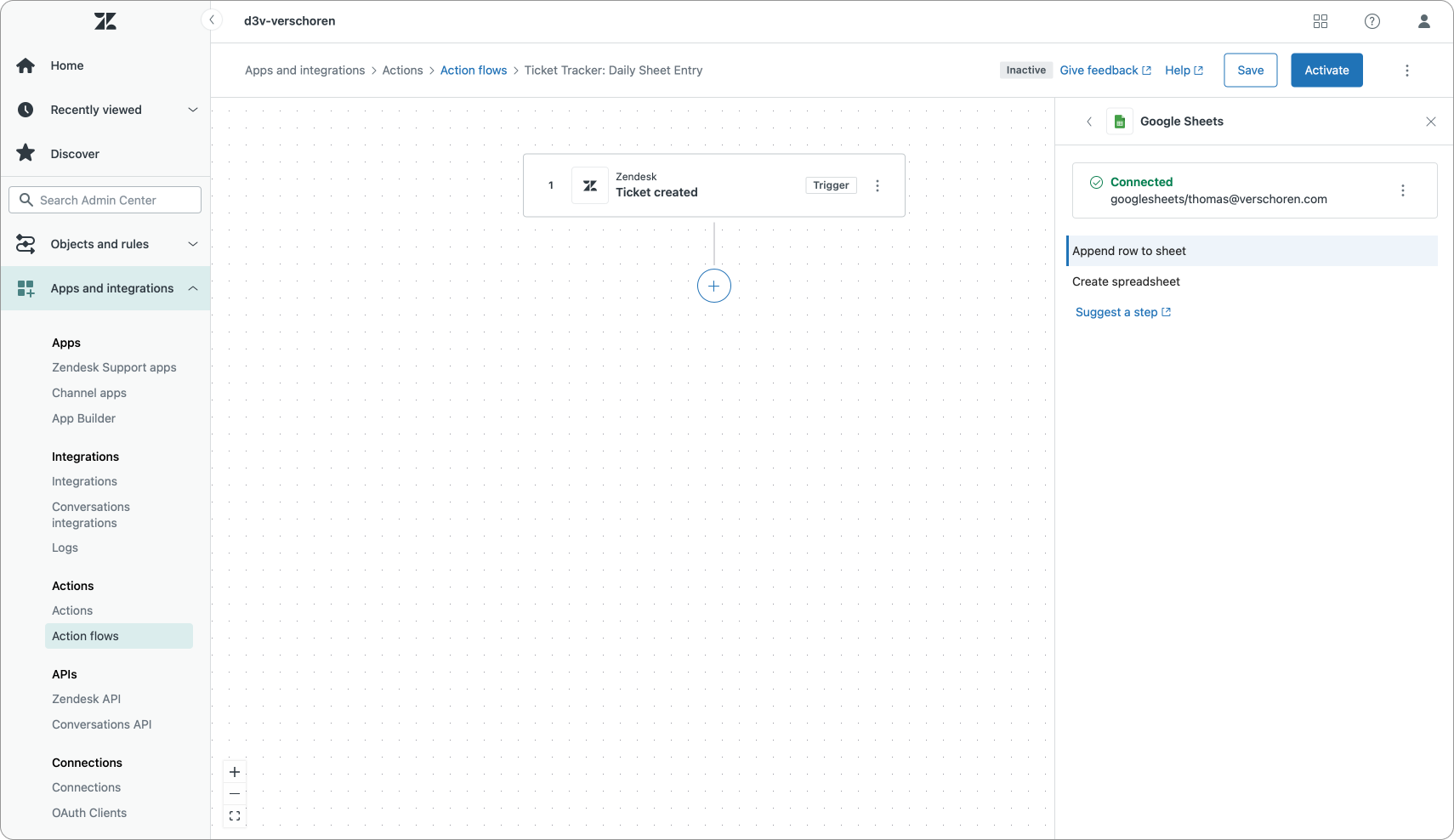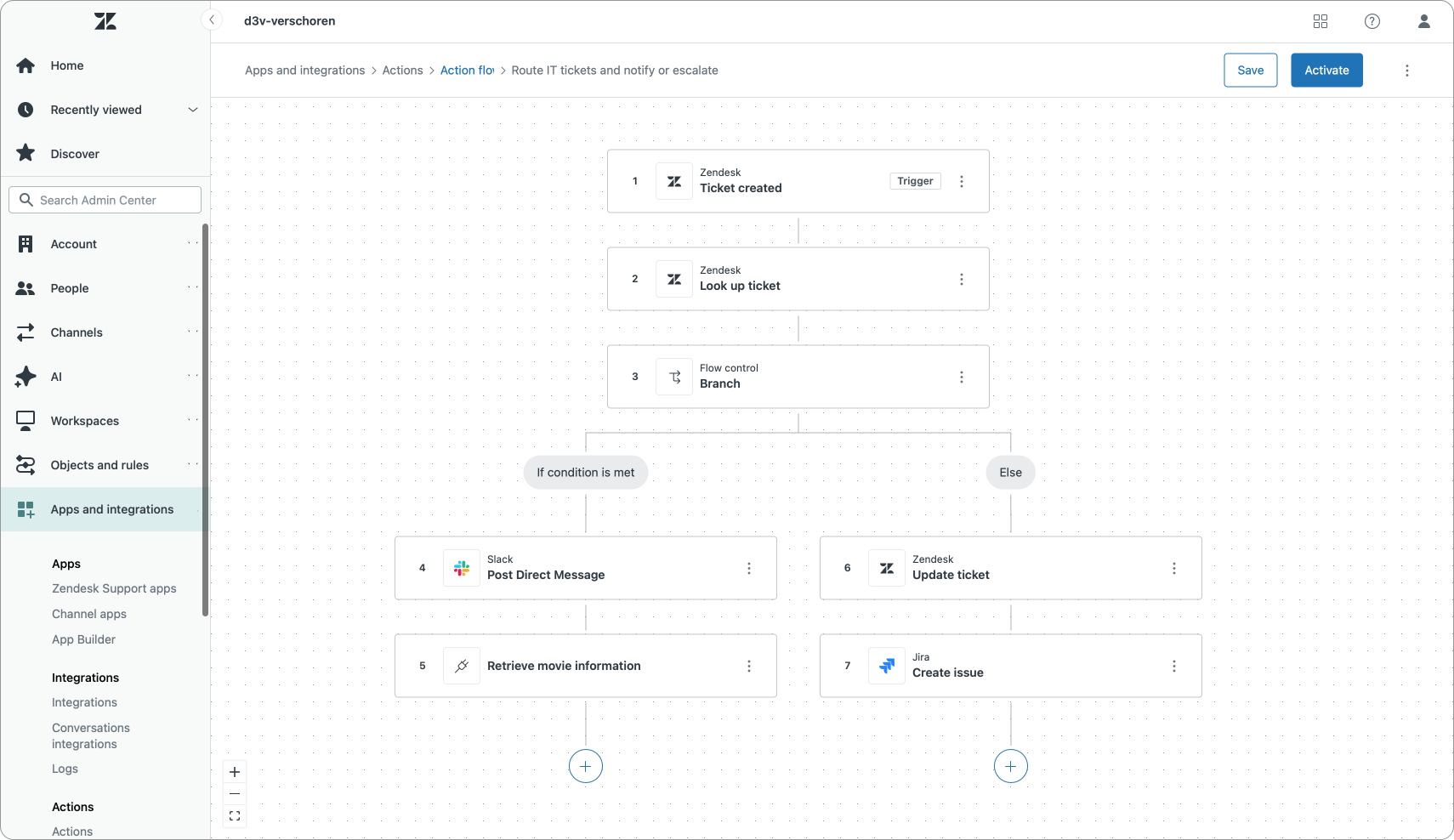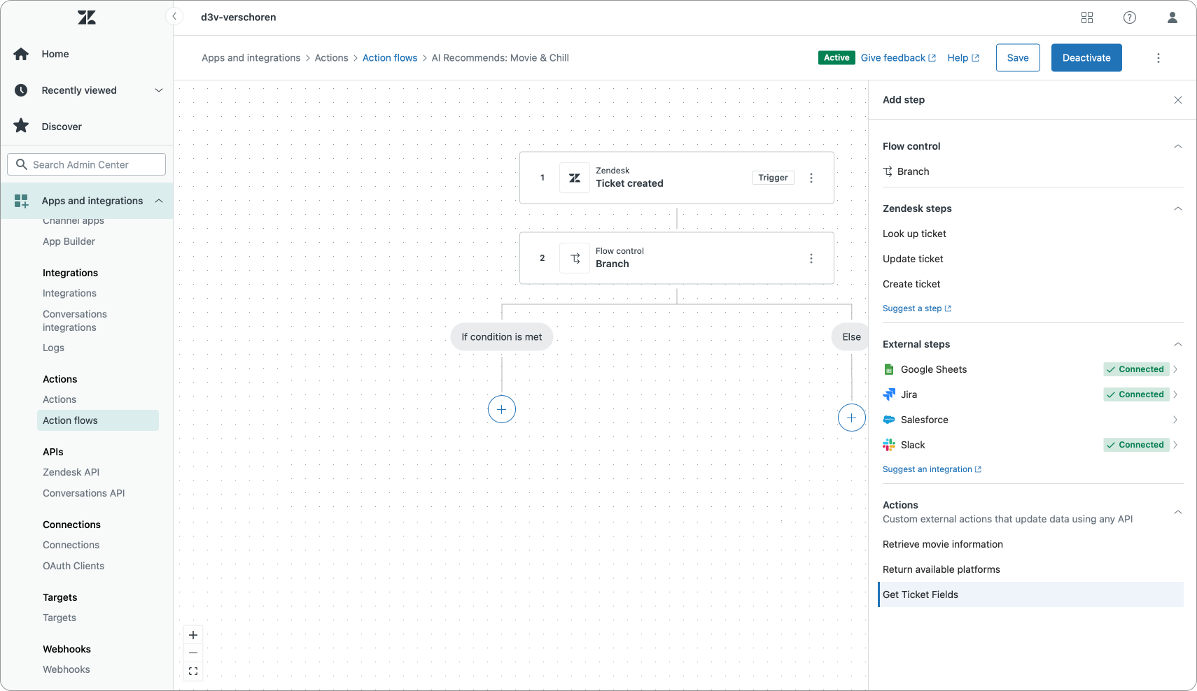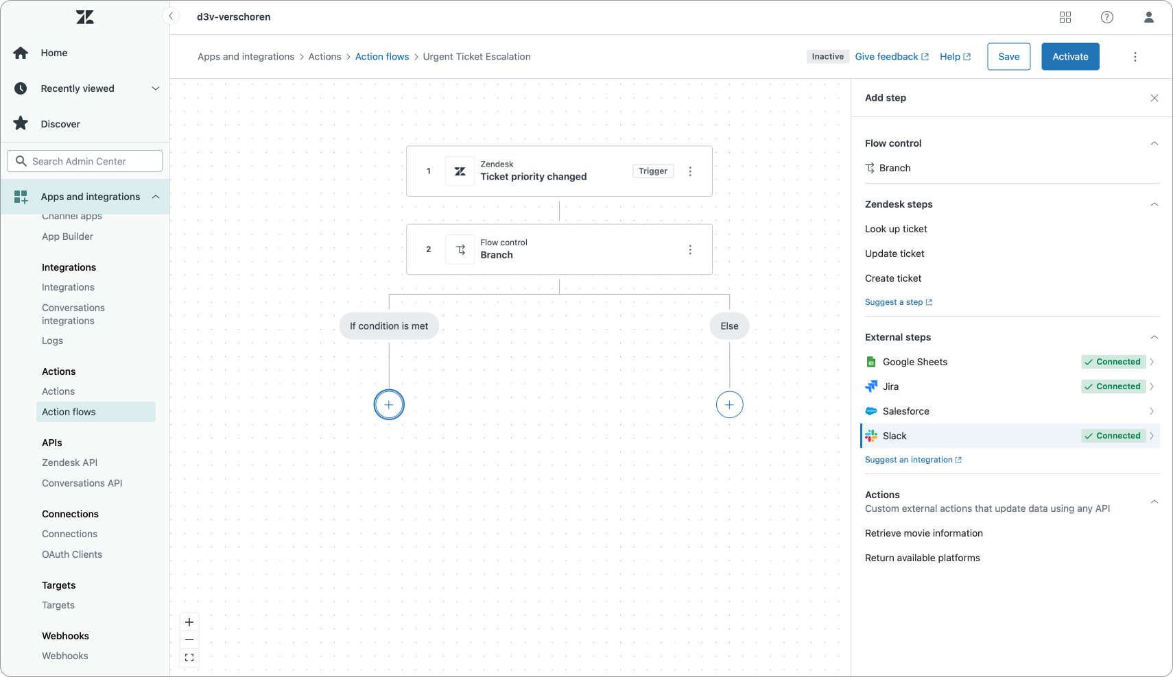 Aside from native actions on Zendesk objects, we can also leverage prebuilt external actions. These can be steps that integrate with Google Sheets (add a row to a sheet), Jira (create or retrieve an issue), Salesforce or Slack (post a message).