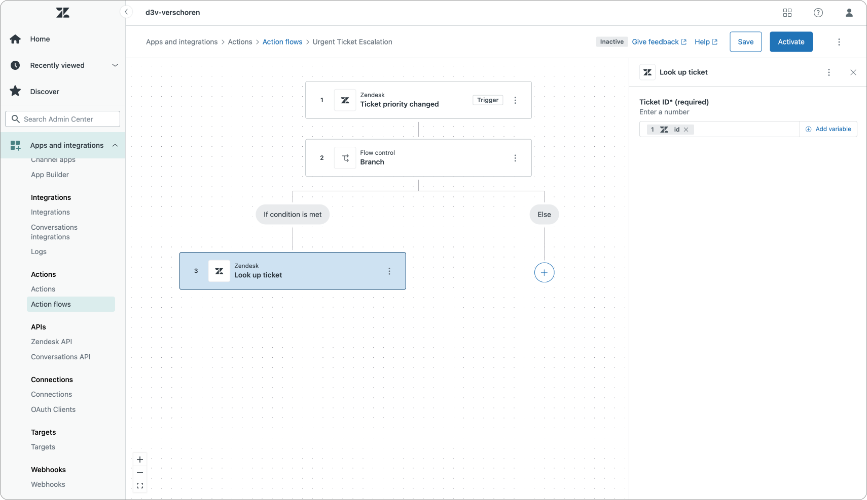 For the high priority branch we then need to look up ticket details. We do this by passing a parameter id to the Look up ticket step. This will give us full ticket details like subject, description, status e.a.