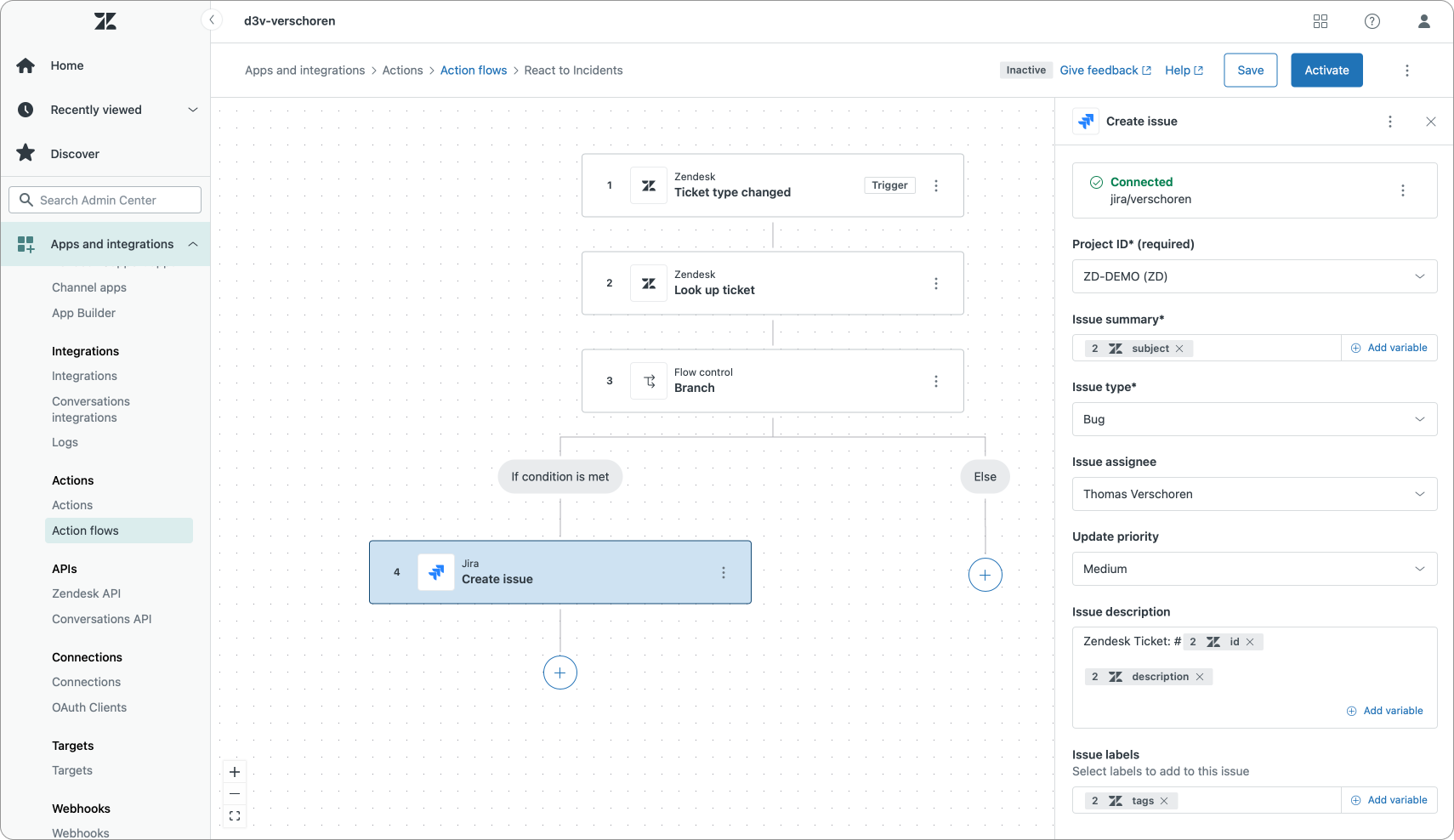 A similar flow can be setup to react to IT related incidents. When a ticket type is changed to Incident, we can react to this change and fire an Action Flow that alerts our IT team in Jira via an Issue.