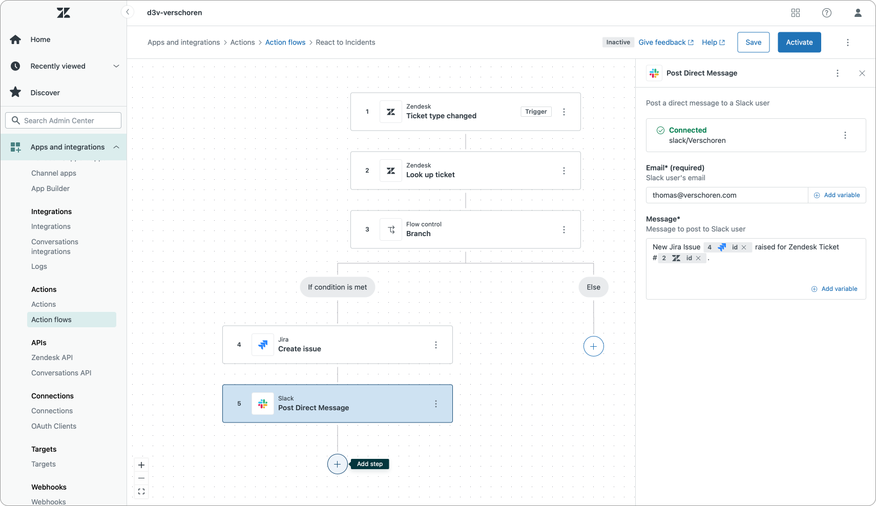 It would be nice if we could select the email address of the current ticket assignee or current user, but for now these values are not (yet?) available, so we have to make due with a hardcoded email. I'd recommend creating a specific user in Slack that posts these updates.