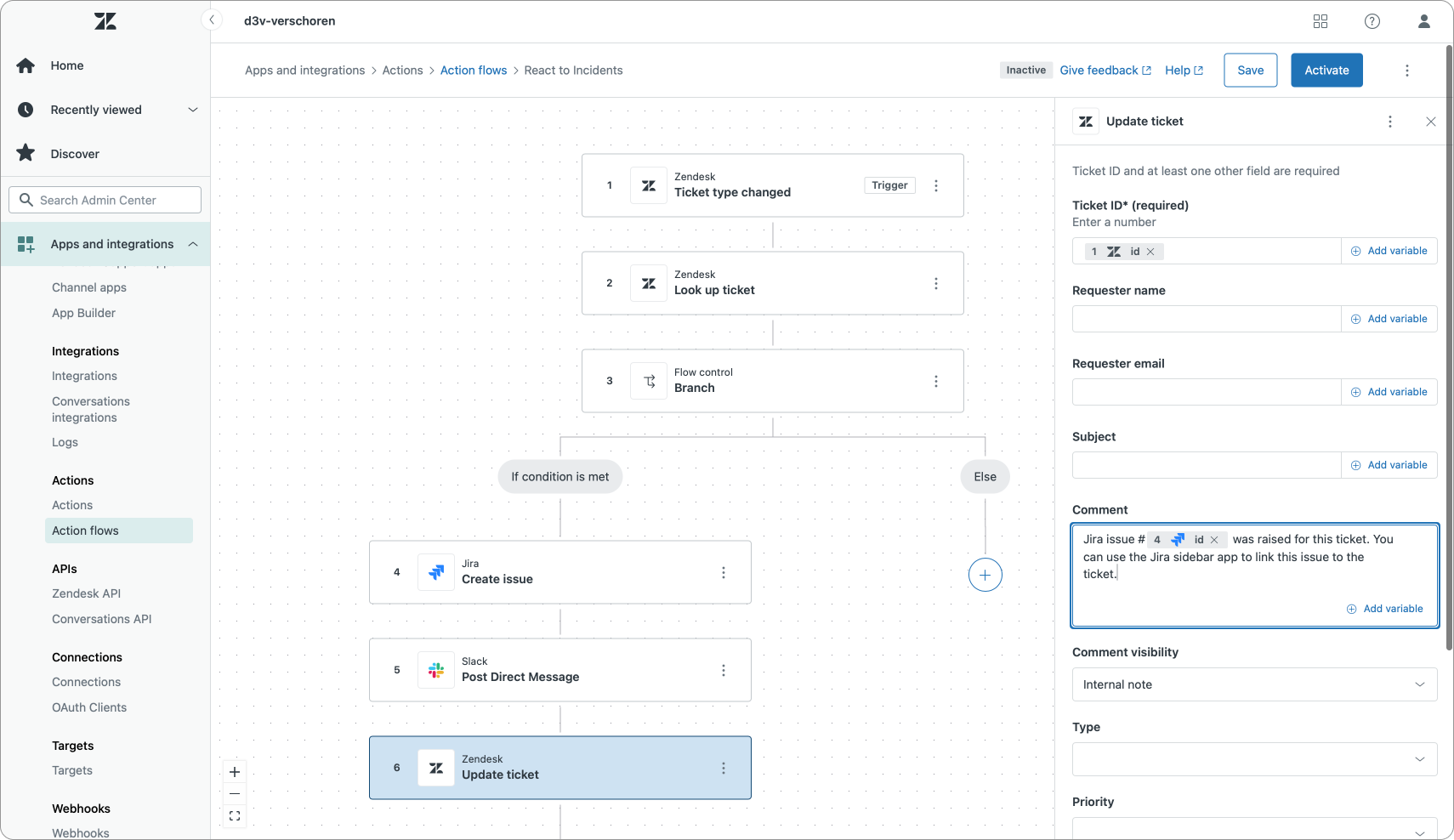 After adding our Jira step we can then wrap up the flow with an Update ticket step. In this step we can add an internal note to the ticket that lets our agents know an Issue was created for this ticket and it adds the issue number to the comment for future reference. And to wrap it all up we can also put our ticket on hold until the IT team reacts.