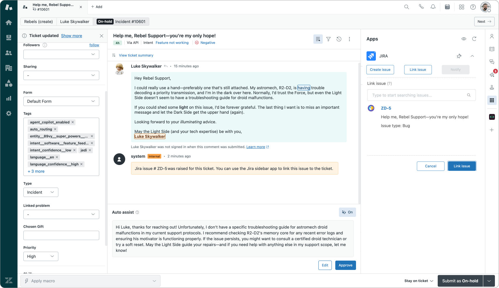 The current Jira integration does not actually link the ticket to the Jira issue yet. It just raised a ticket. To complete our Action we need to dive into the Zendesk API.