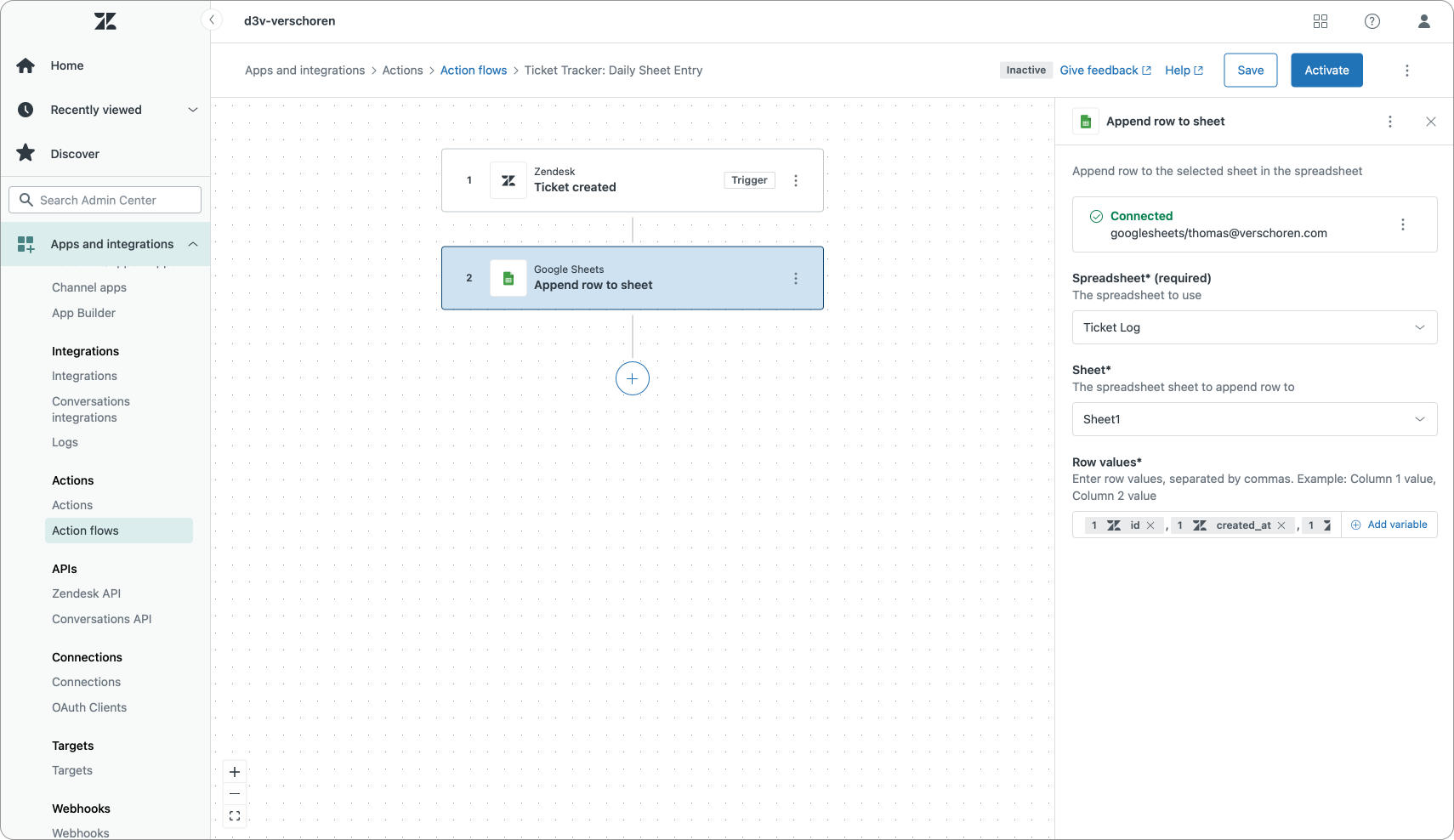 Aside from Slack and Jira we can also integrate with Google Sheets. This integration makes it possible to log specific ticket actions for reporting purposes in a Google Sheet.