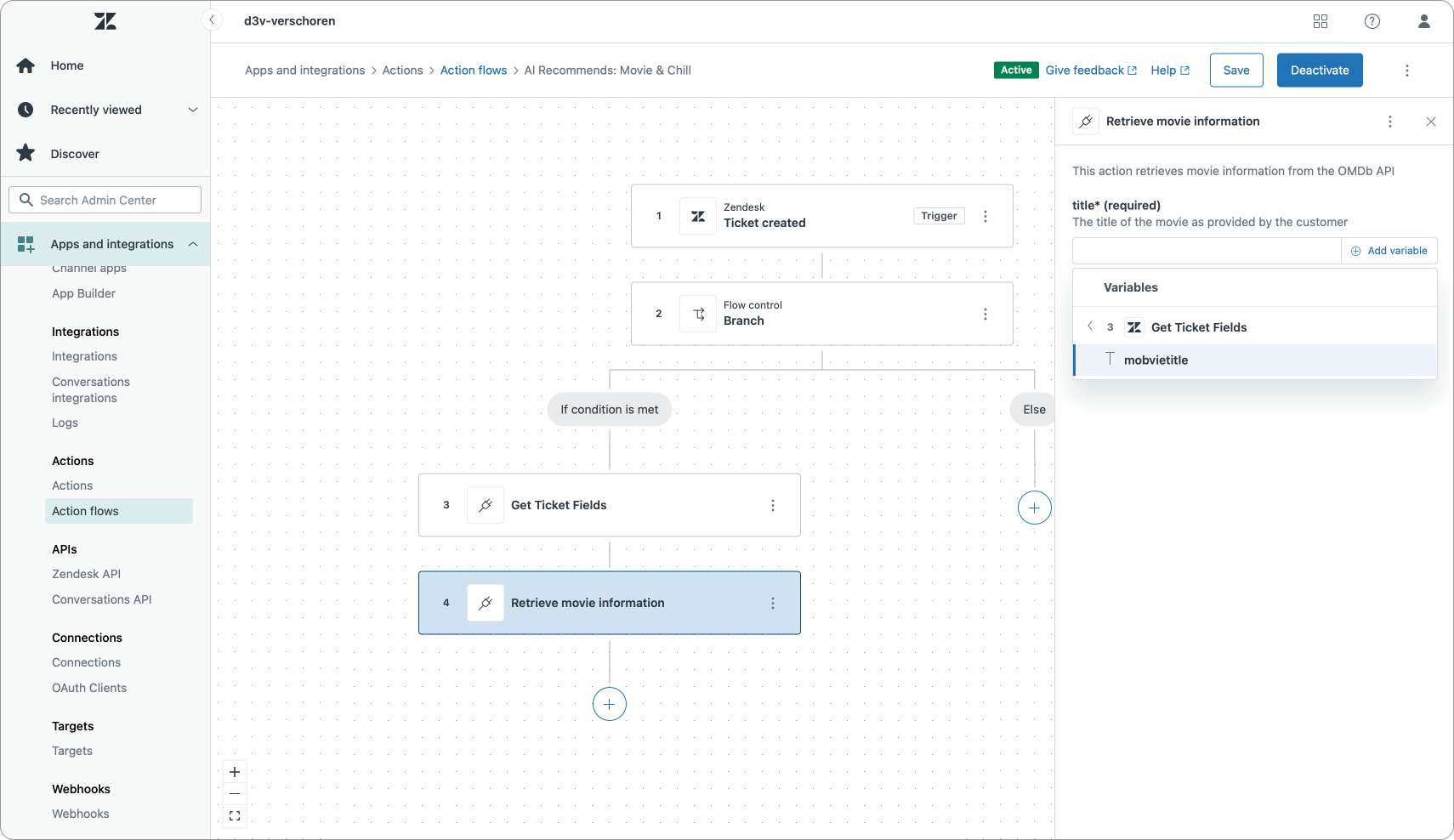 The next step is retrieving some ticket information. Users submit their requests via a webform or AI Agent and we store their chosen movie in a ticket field. Action Flows do not currently allow us to retrieve ticket field values, but by leveraging Actions we can easily circumvent this.