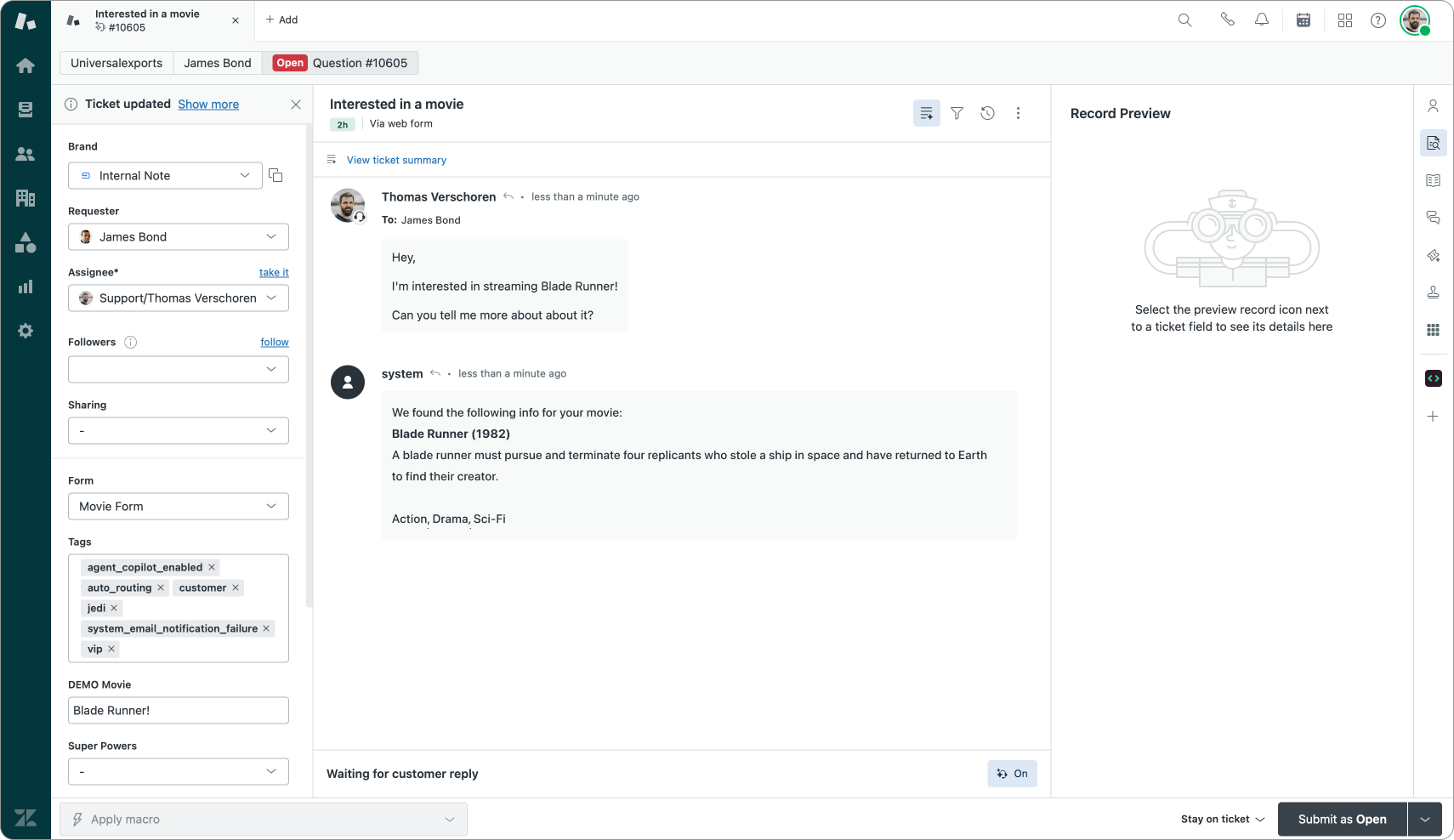 And to wrap up we add an Update ticket comment step to share the movie title, release data, summary and genre to our customer as a public comment.