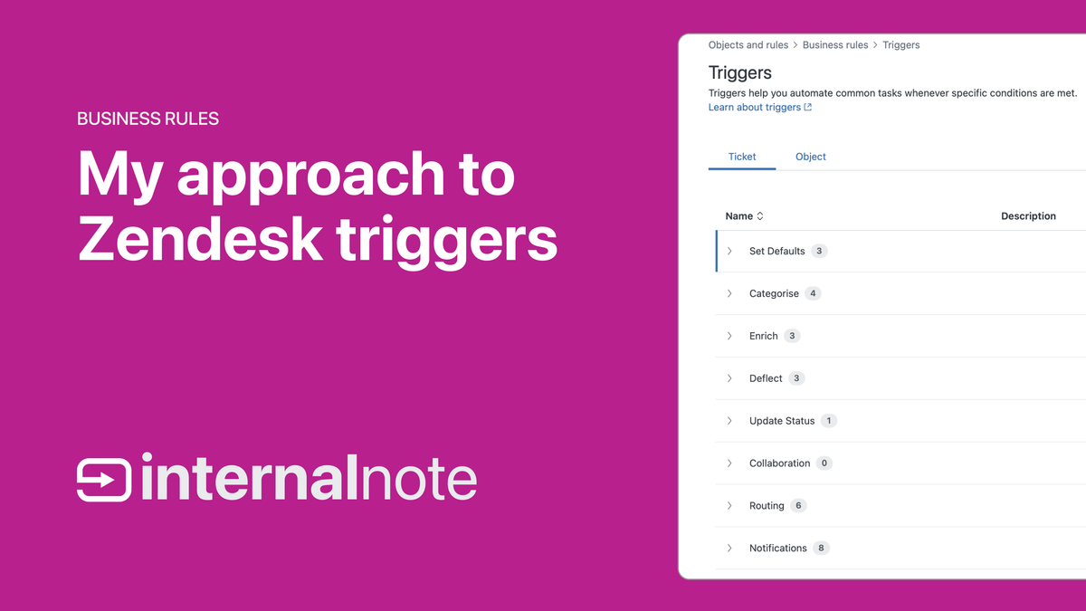 Triggers (and automations) work great but any seasoned Zendesk admin knows the terror of opening an existing Zendesk environment and peaking into the triggers list. You're often greeted with dozens and dozens of triggers without any logic to them. Within those triggers you'll find complex conditions to include (or exclude) certain tickets without any obvious rhyme or reason.