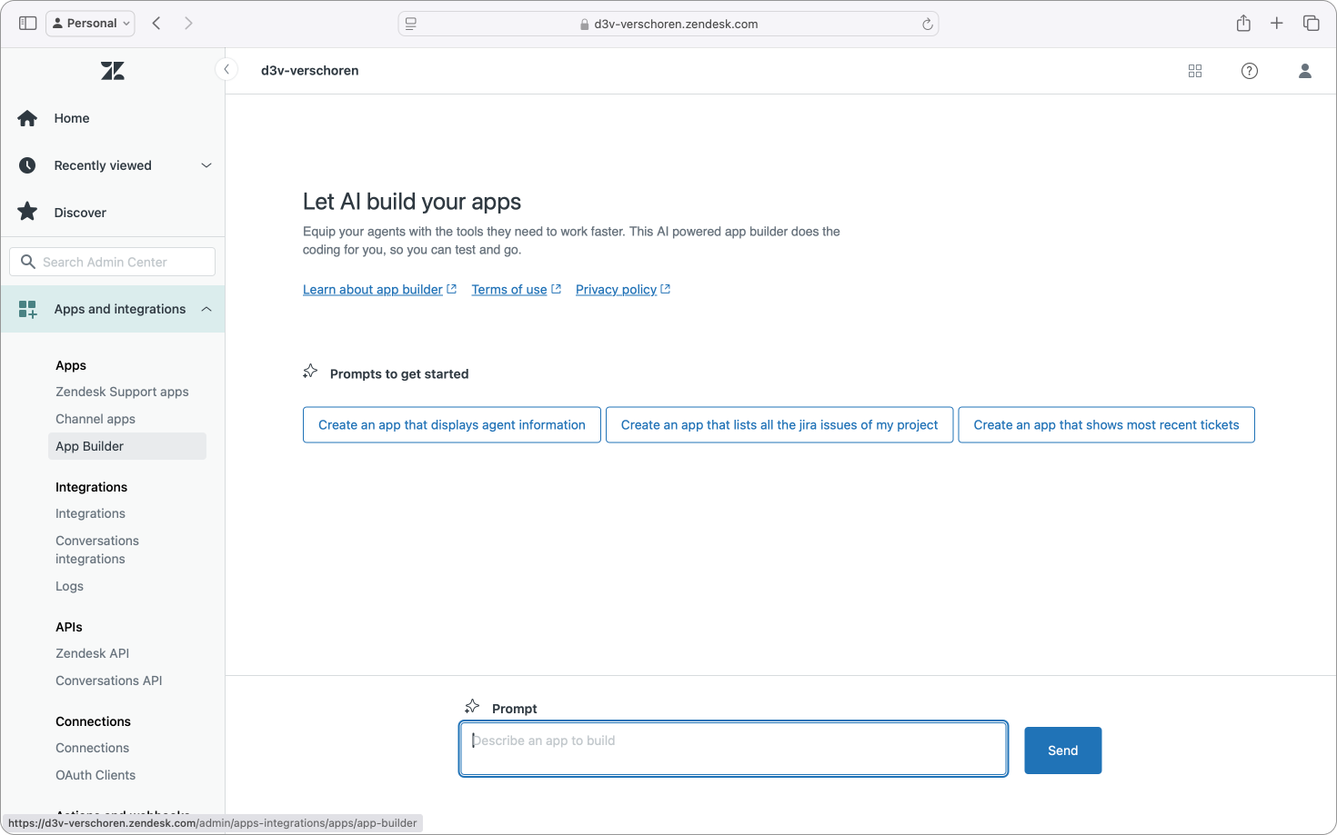 App Builder is a new feature that lives inside of Admin Center which allows you to build Zendesk sidebar apps via conversational interactions, similar to how you would talk to GitHub Copilot.