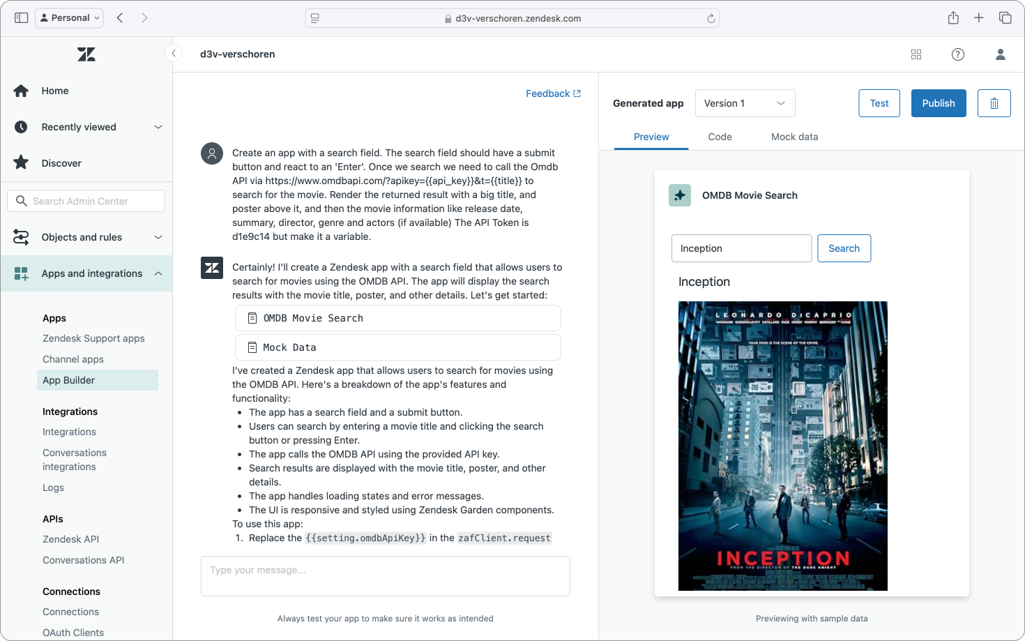 What I liked about this type of app in the App Builder was the way it managed to accurately represent the external API within the preview next to the conversation.