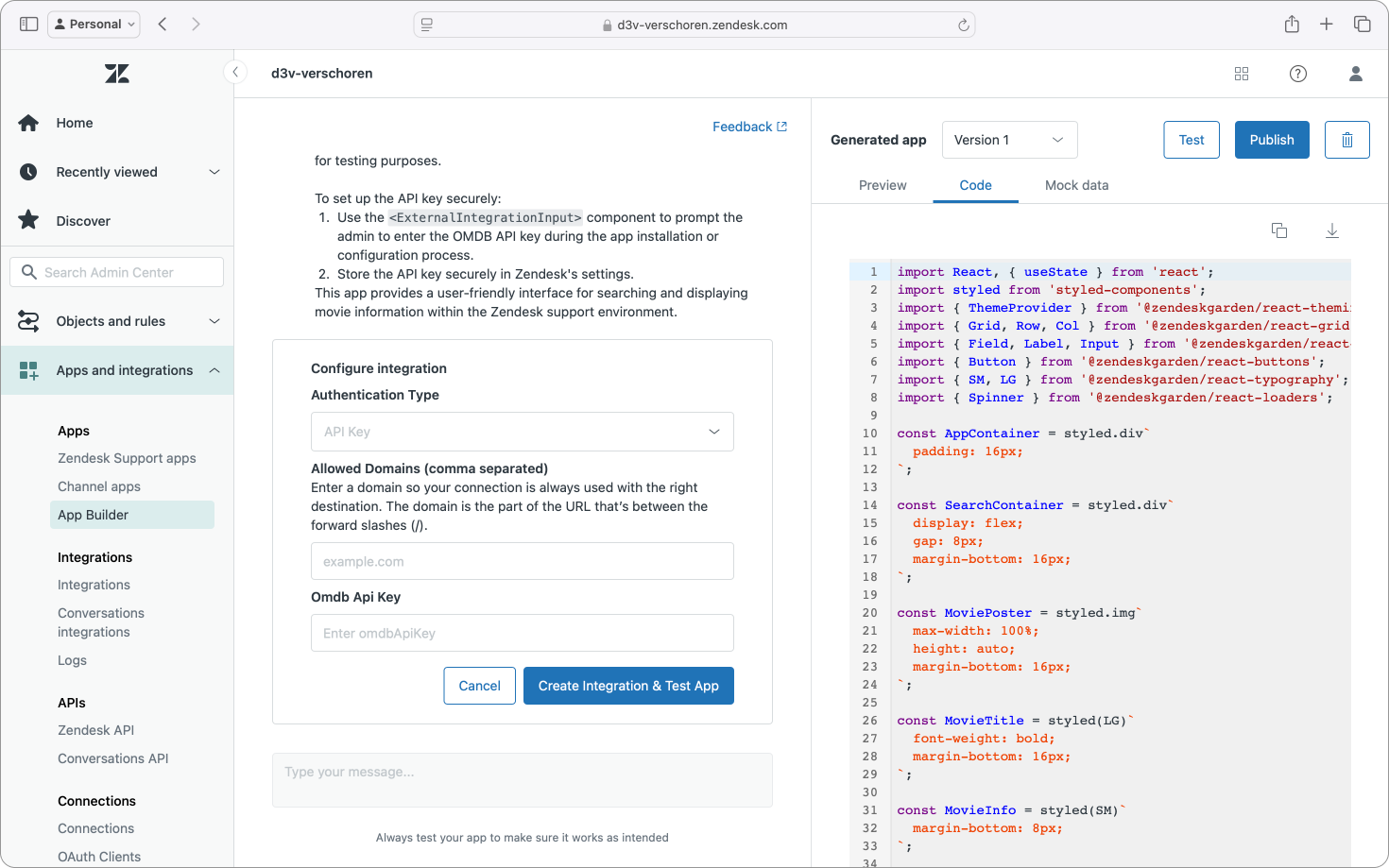 The only thing left was click publish and install the application in my Zendesk instance. What's nice here was that the app showed inline setting during publishing to set my API key, which was then uploaded and added to the apps in my instance.