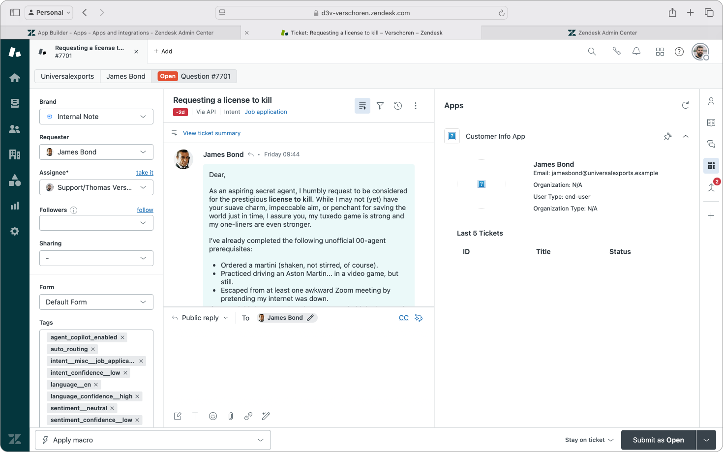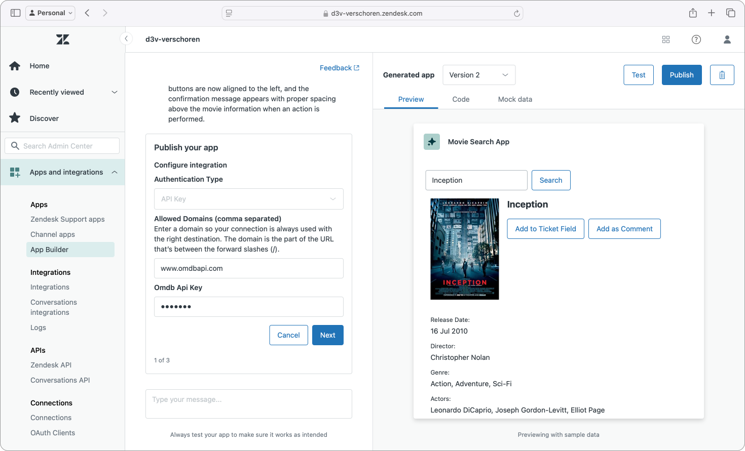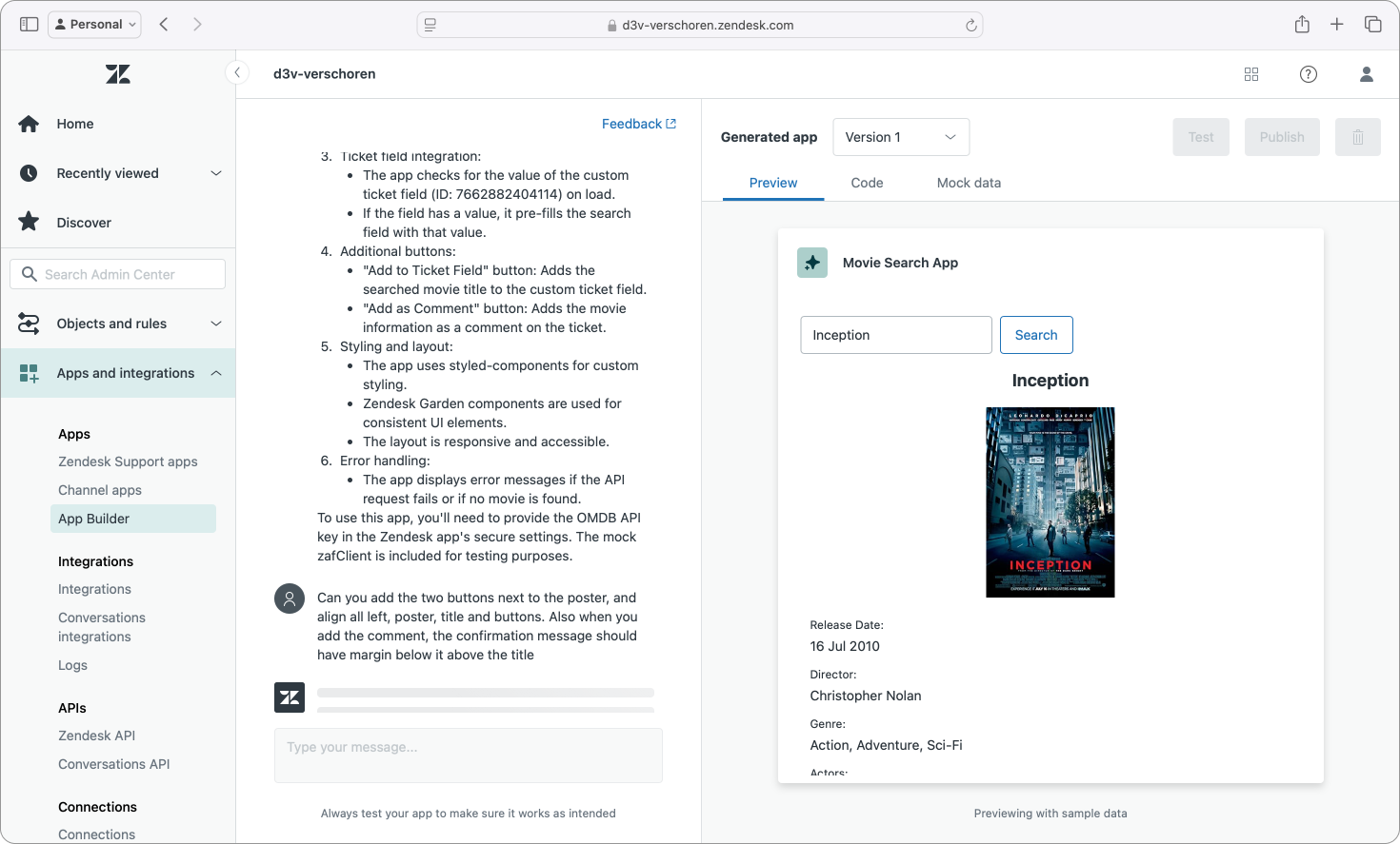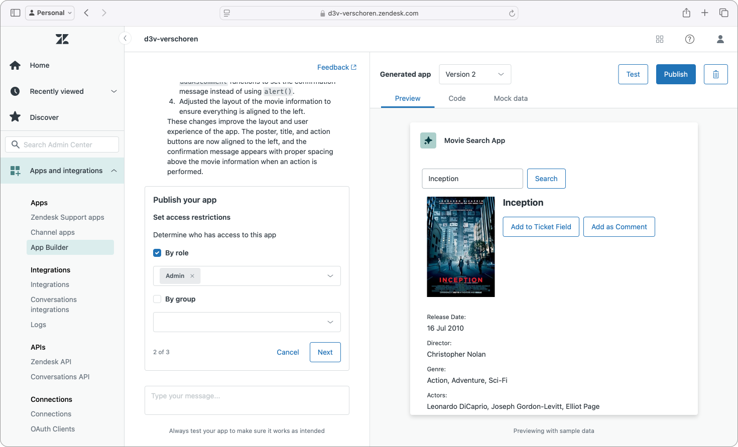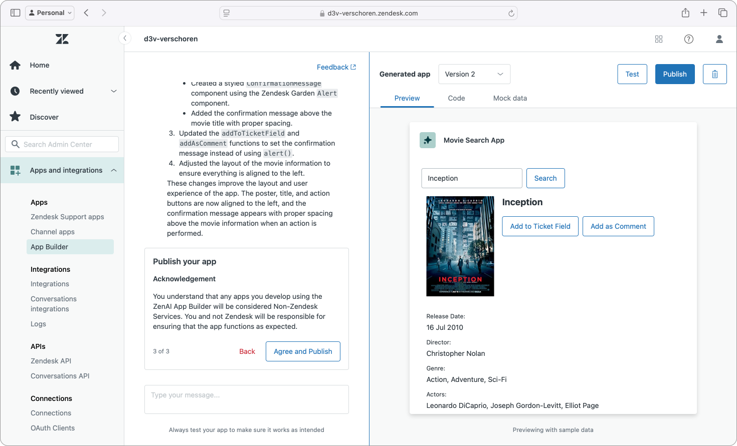 Especially powerful during the development of the app (if you can call it that) was that I could still test the app live in Zendesk. Yes, this is also doable via zcli apps:server for apps I build via VSCode or other editors, but the fact that this entirely web based tool offers the same capabilities was both impressive and useful.