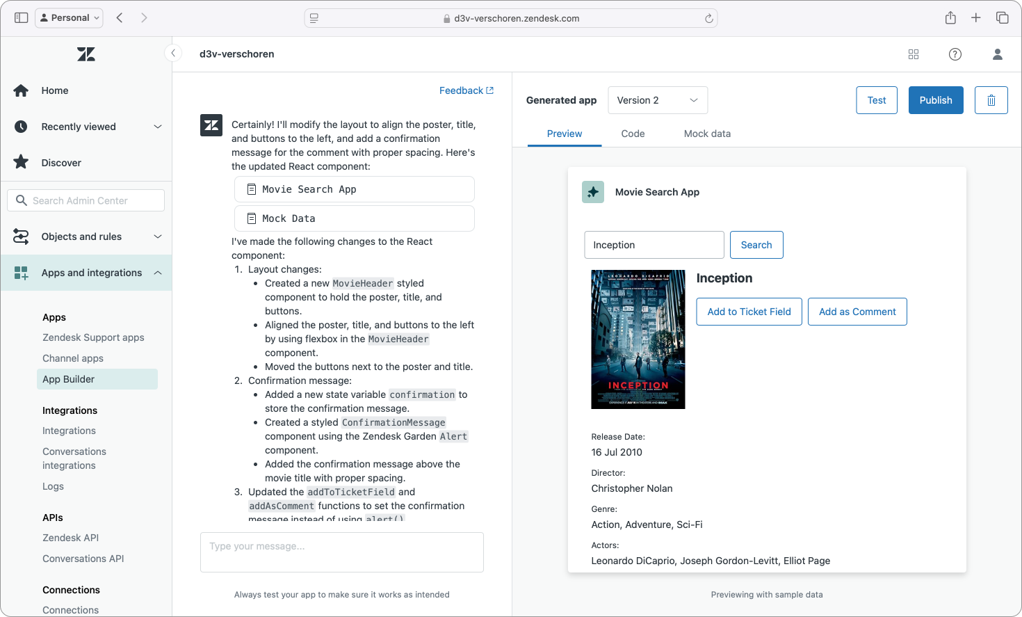 Both tools did have their issues with understanding the framework though, and even the platform-native Zendesk App Builder made the same mistakes as ChatGPT when it came to mapping placeholders and object paths.