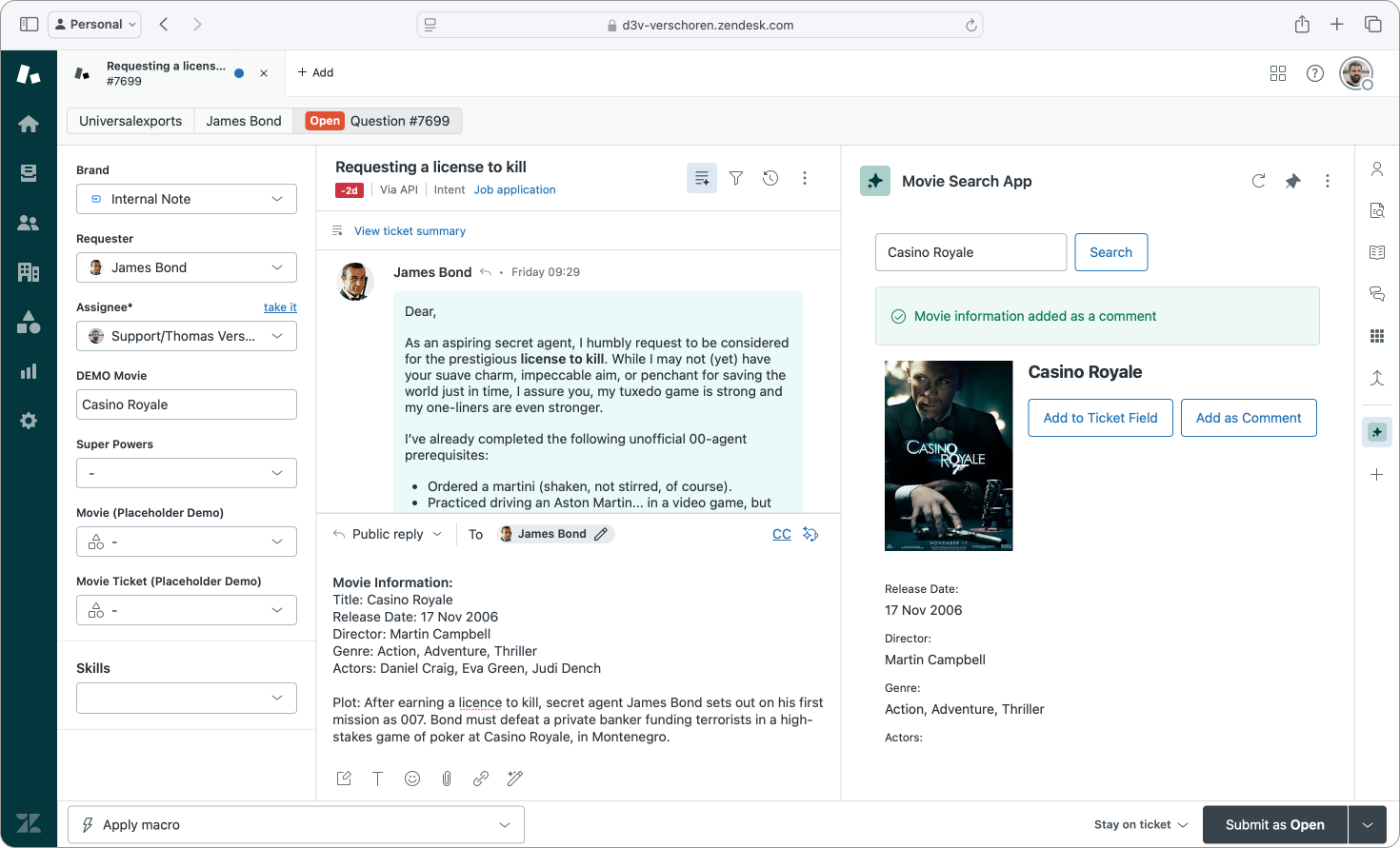 Also add two buttons. One button adds the search movie to the ticket field, the other adds the movie information as a comment on the ticket.