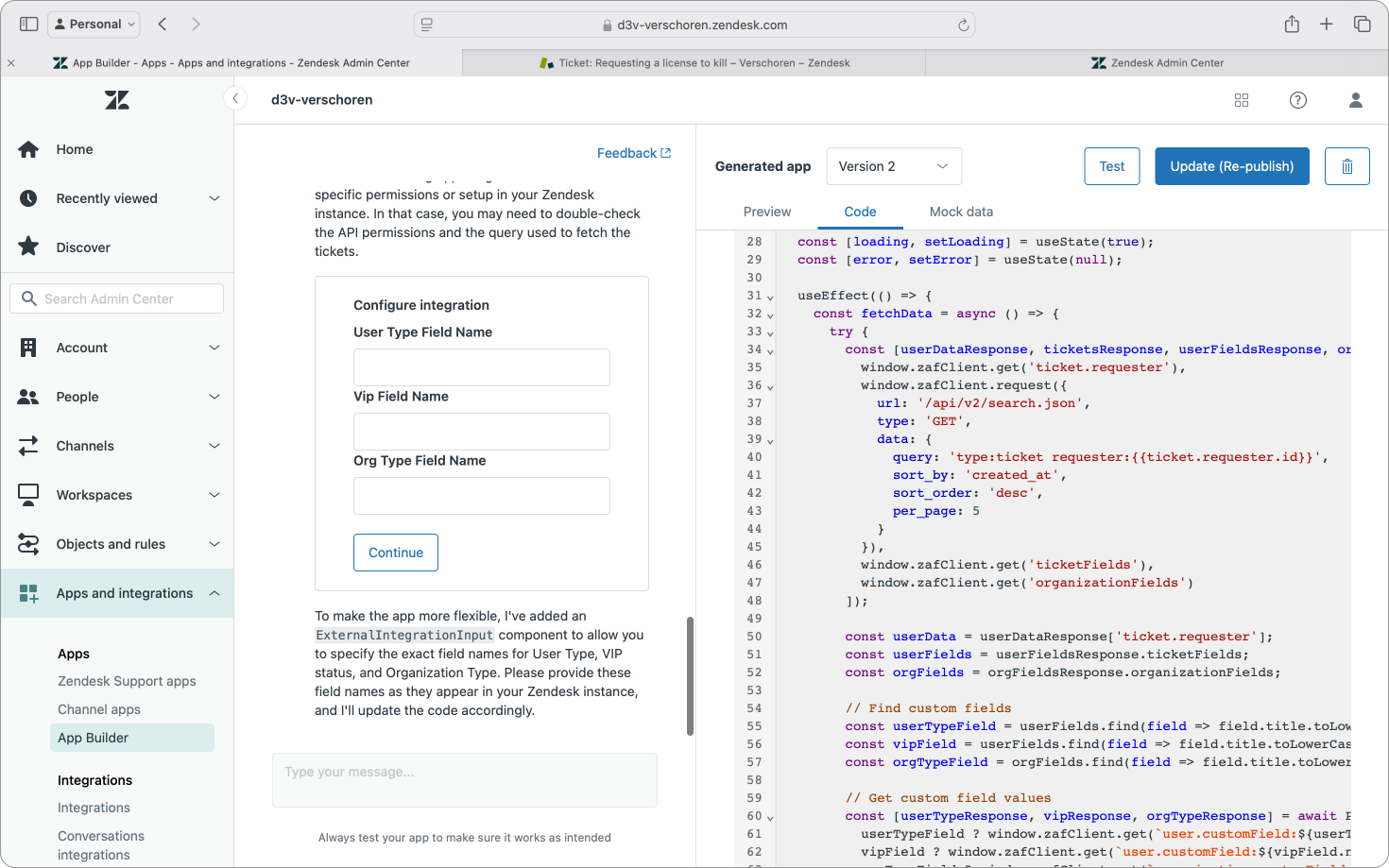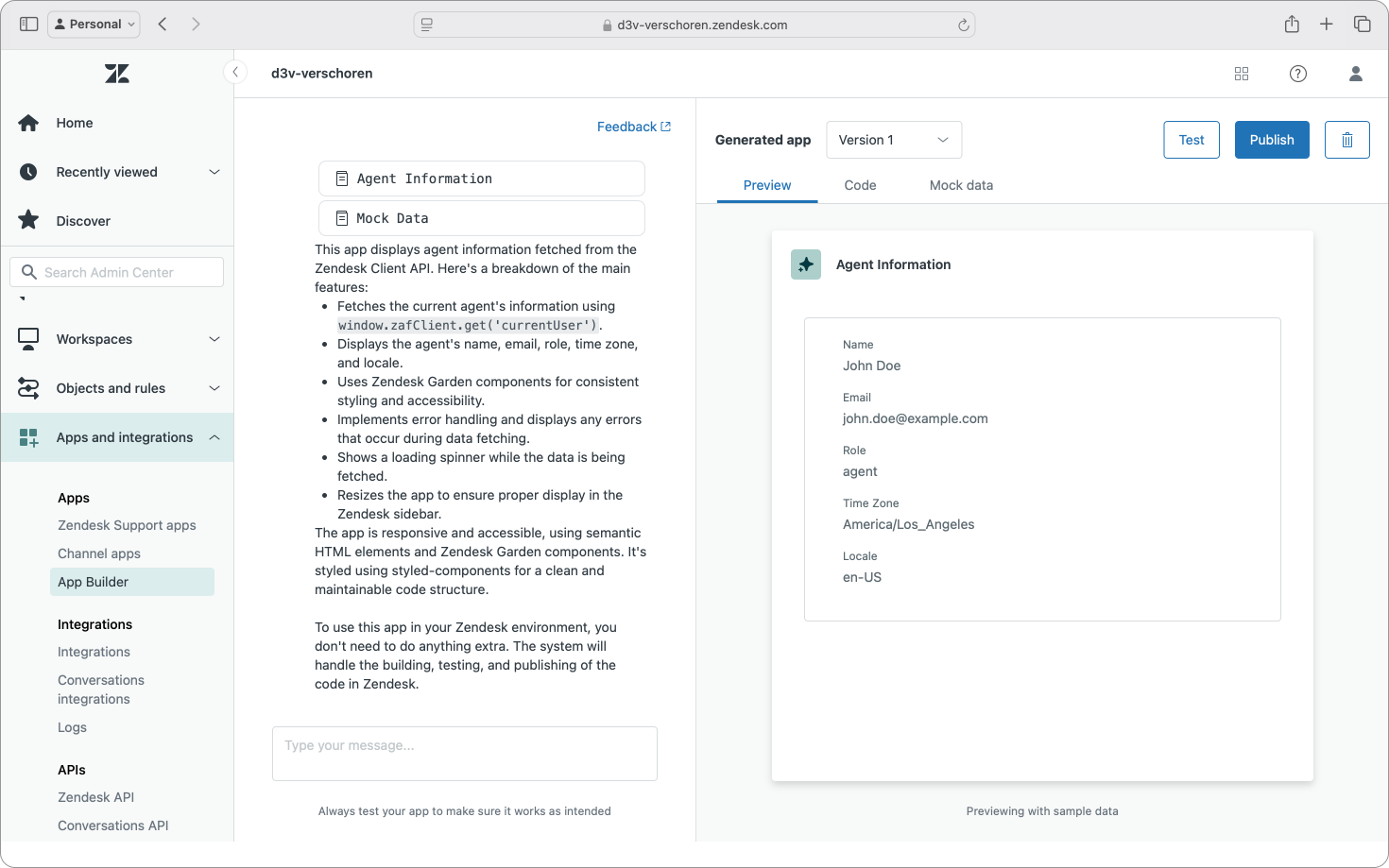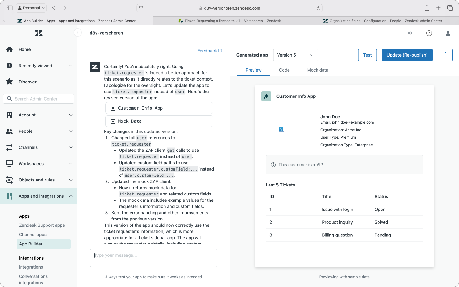 };Similarly, if your app calls Zendesk APIs (like ticket information, requester data e.a.) this mock data section also returns fake data instead of actual data from your instance, allowing you to test and iterate without affecting your actual data. Pretty nice and it does show the App Builder has deep insight in how Zendesk is structured.