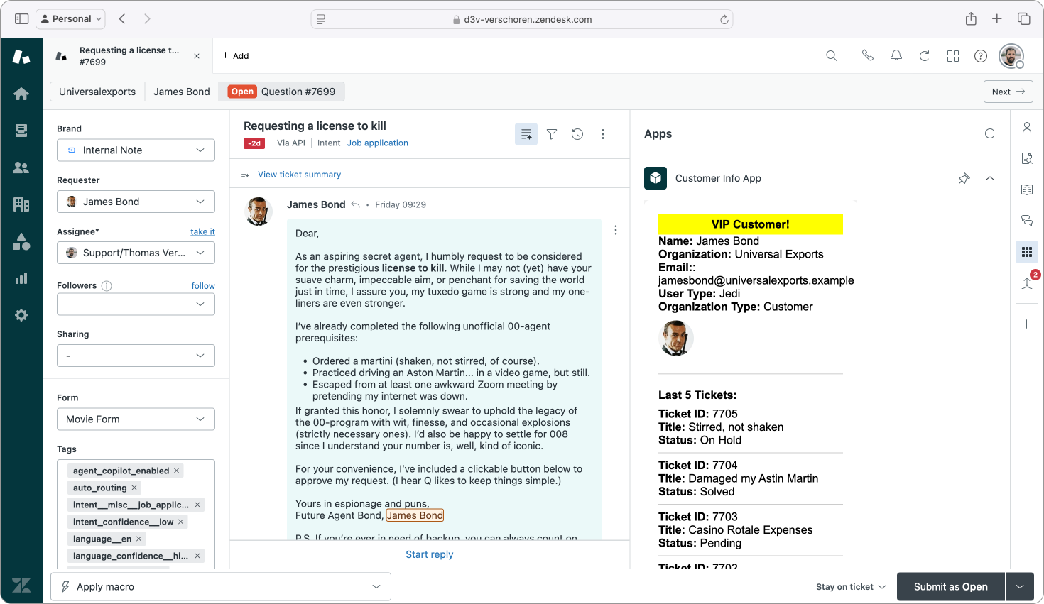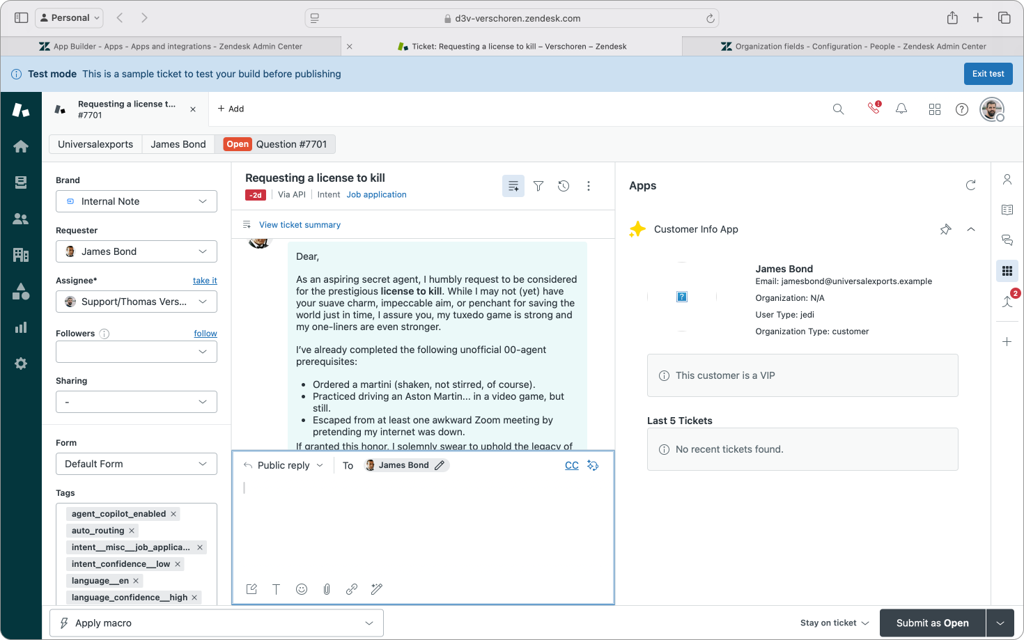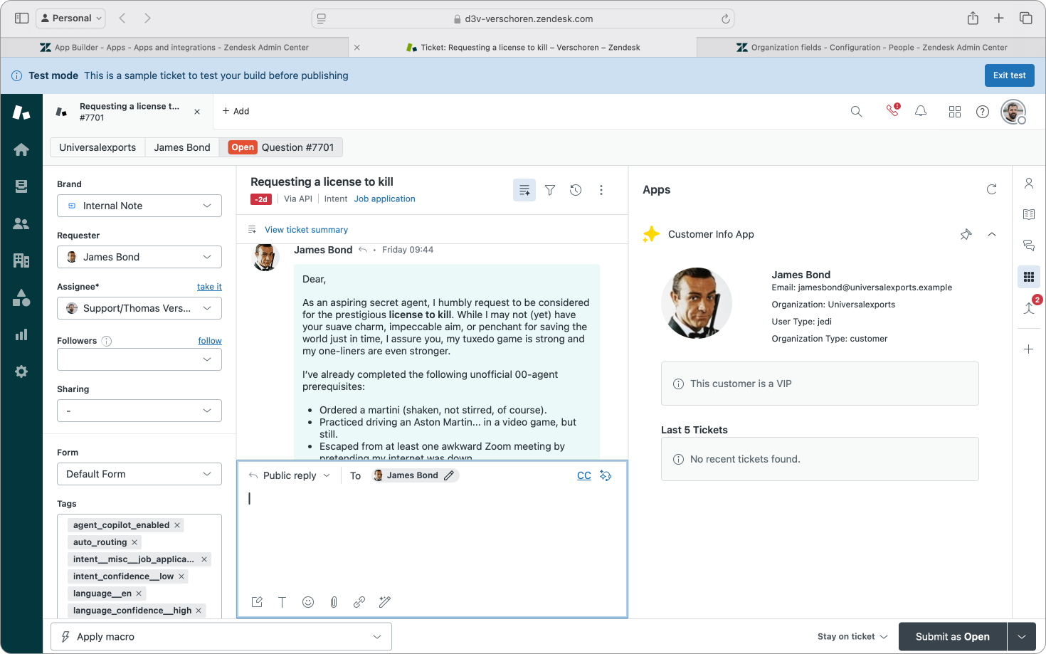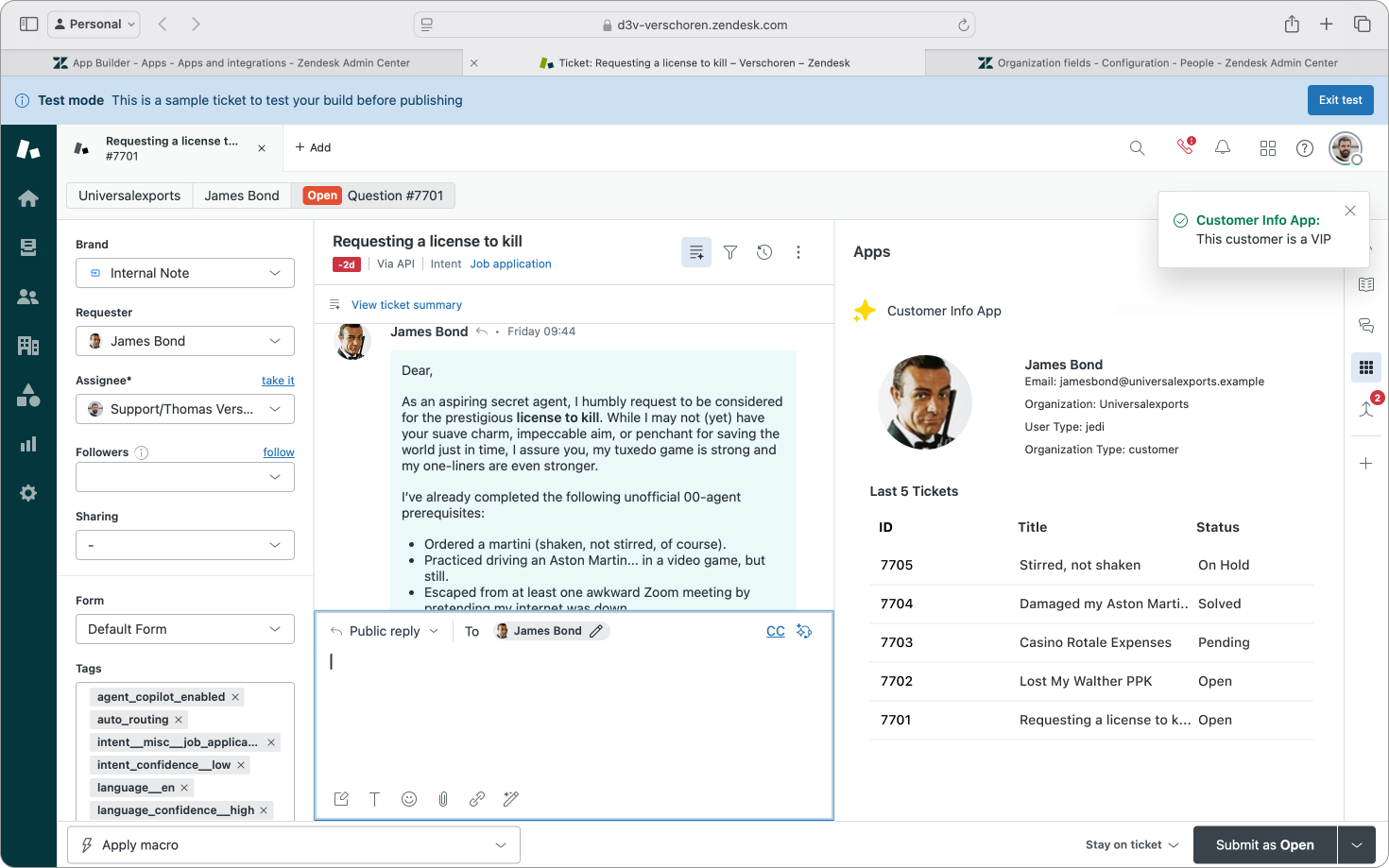 In this first app I'm going to build a "simple" app that shows data of the current requester next to the ticket. It'll show both end-user and organization data, a few recent tickets and will alert the agent if the customer is a VIP user.