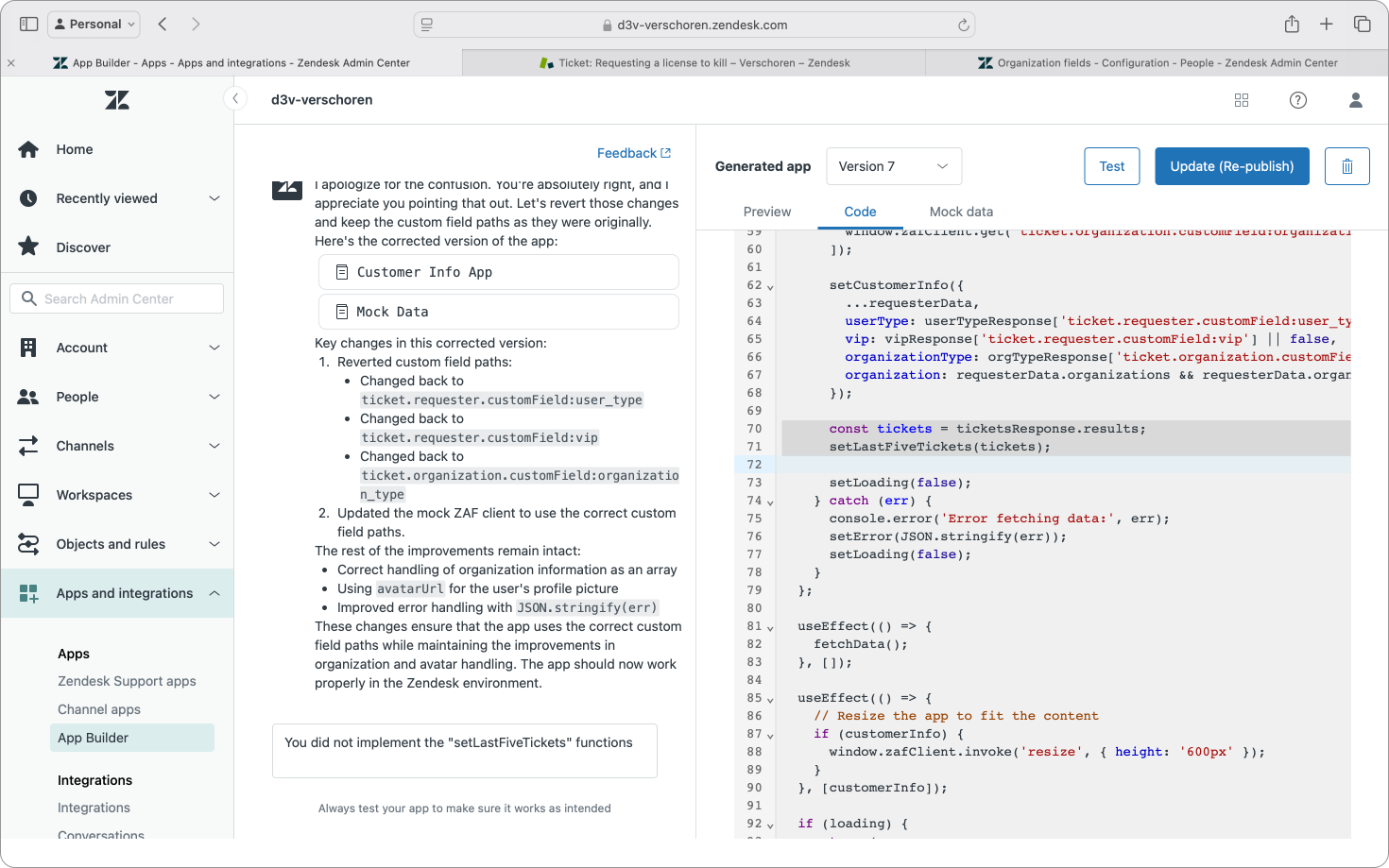 During the further iterations some gaps did show up though. It used the wrong objects, it forgot to render the recent tickets and it clearly needed some extra guidance to grasp how Zendesk worked. Something you would expect from a Zendesk App Builder to understand Zendesk objects as basic as requesters, organizations and tickets.