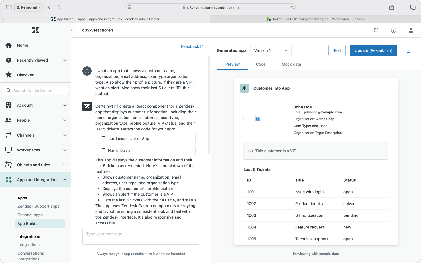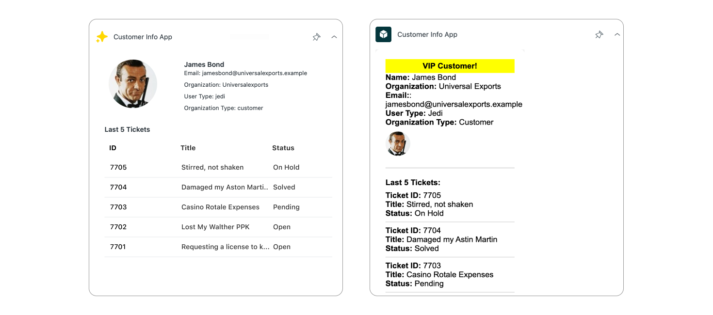 I want an app that shows a customer name, organization, email address, user type organization type. Also show their profile picture. If they are a VIP I want an alert. Also show their last 5 tickets (ID, title, status)