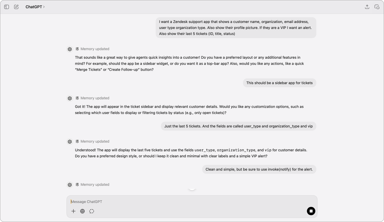 I gave it the first initial prompt and went from there. Where Zendesk App Builder immediately gives me a working prototype, I had some troubles getting the code to work with ChatGPT. It invented fake Zendesk functions, forgot to include the link to the app framework.js cdn and similar problems.