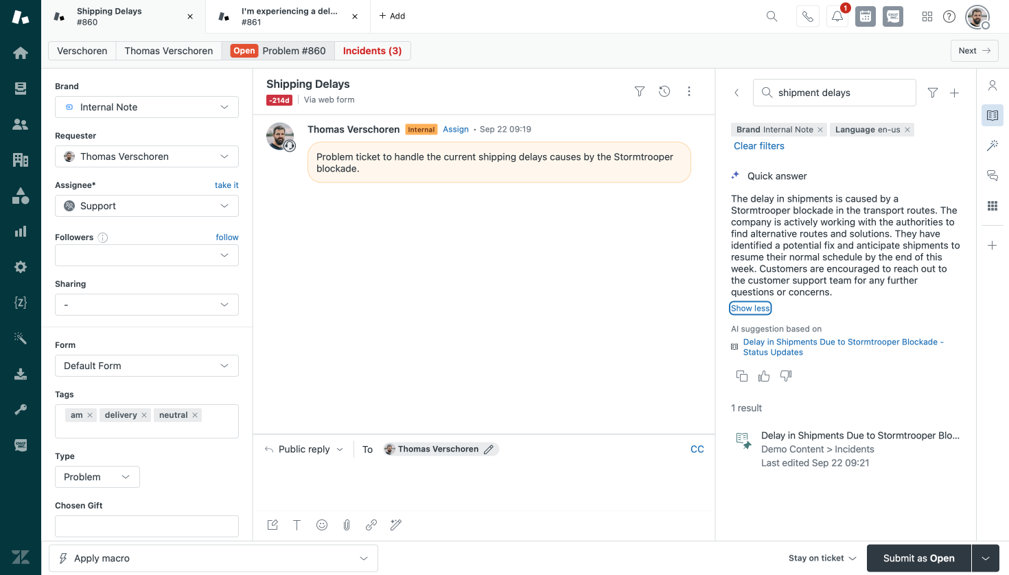 Preview of the new generative search for Zendesk Knowledge Base and Agent Workspace