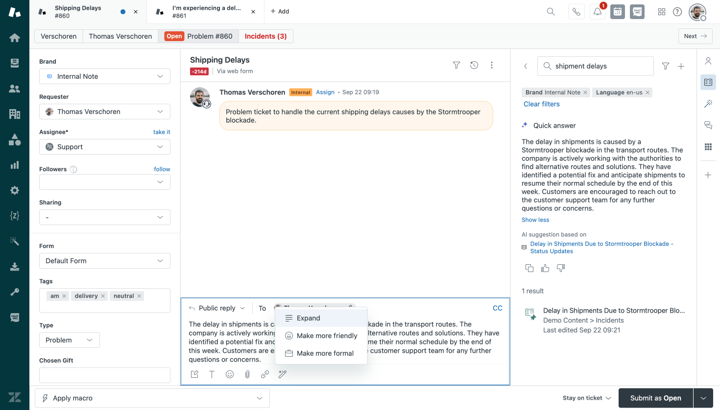 We now have the expand/tone-shift feature to turn sentences into real comments. We've got quick reply to propose answers. We've got macros which combined with expand/tone-shift give custom responses. And soon we'll have suggested replies that rewrite an answer for agents with a tab-to-complete.
