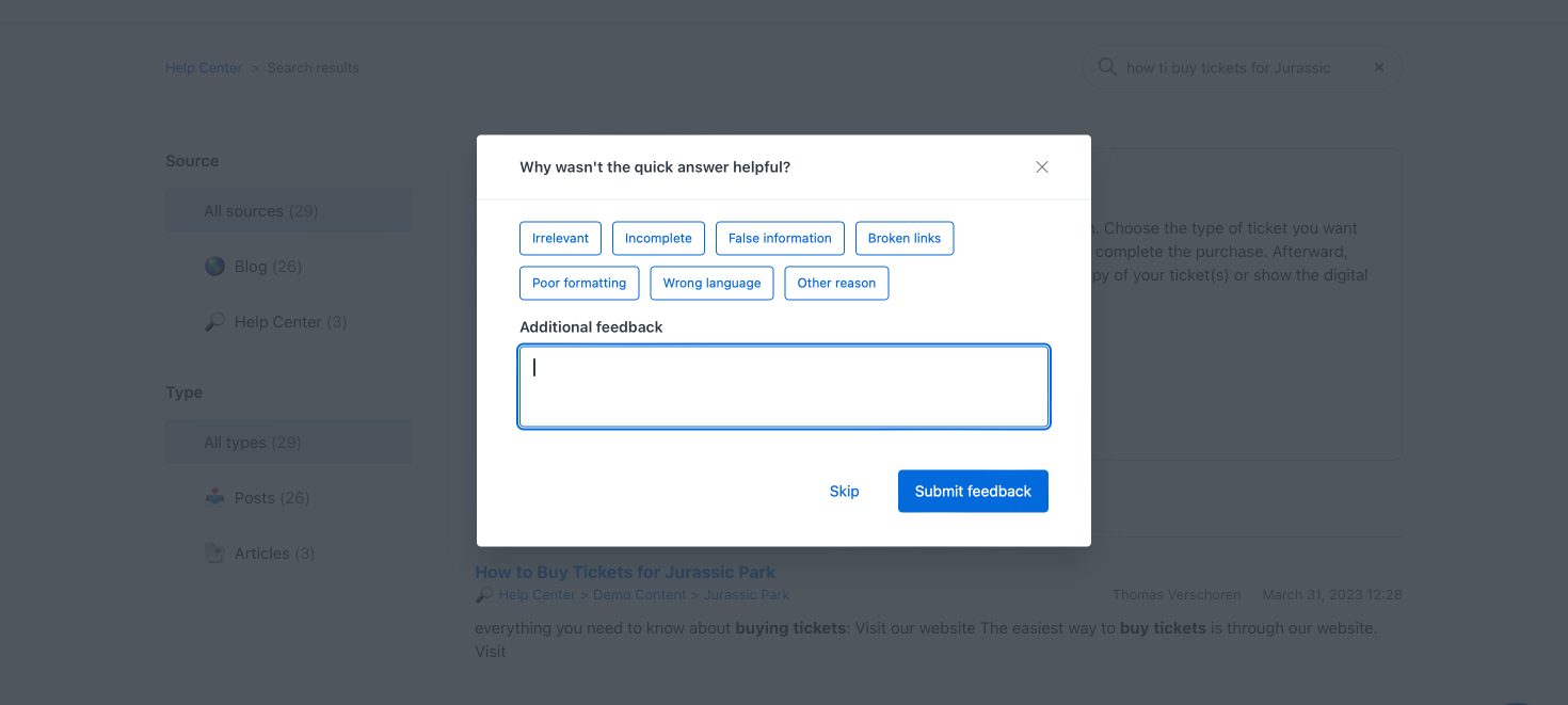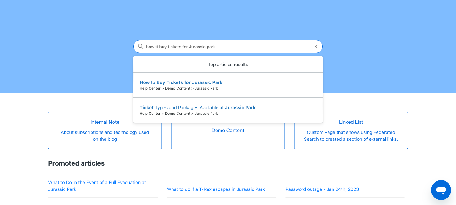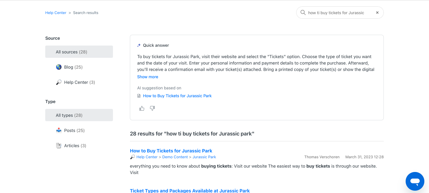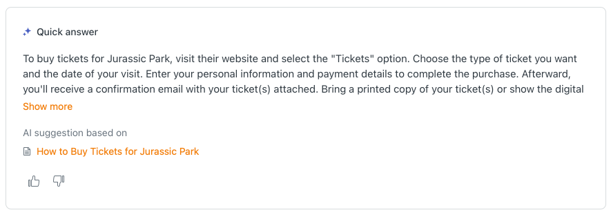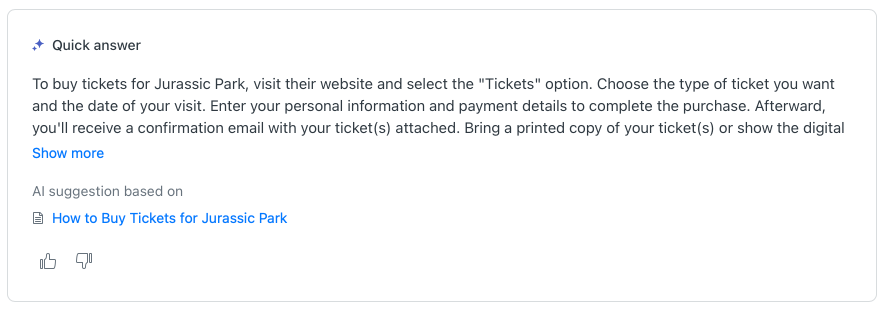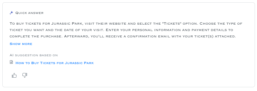 Once enabled, when a customer searches for something like "what do I do if a T-Rex escapes?", the search results will no longer just return a list of relevant articles. On top of the page it'll show a new Quick Answer block that contains a generated response to your question: