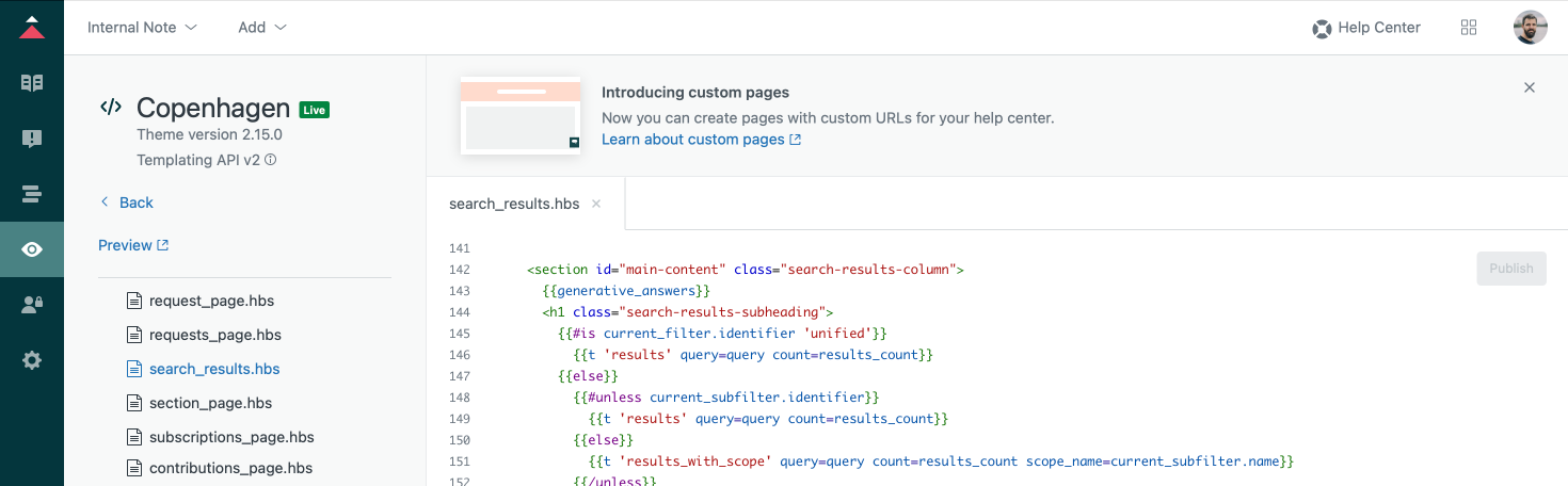 If you have your own custom theme (and if you haven't you really should!), enabling the new feature is done by adding a new placeholder {{generative_answers}} to the search_results.hbs template in your theme code editor. (Do make sure you're running a v3 version of your theme, and not an older theme)