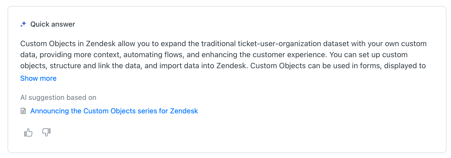 What's nice is that these answers are not only limited to your Help Center content, but will also index and return data from external sources added to Zendesk via Federated Search. For example, searching my Help Center for custom objects returns content pulled from this very blog!