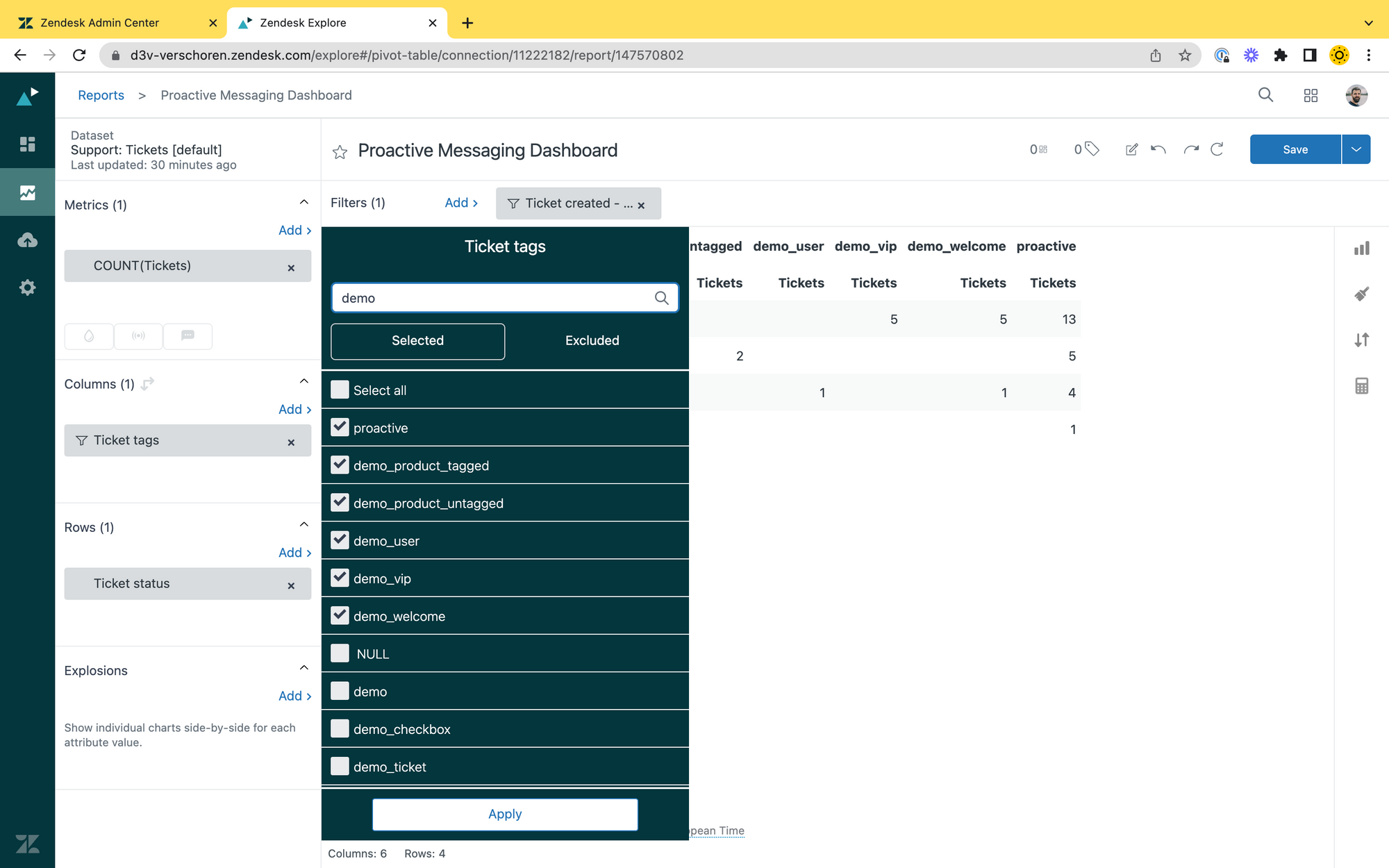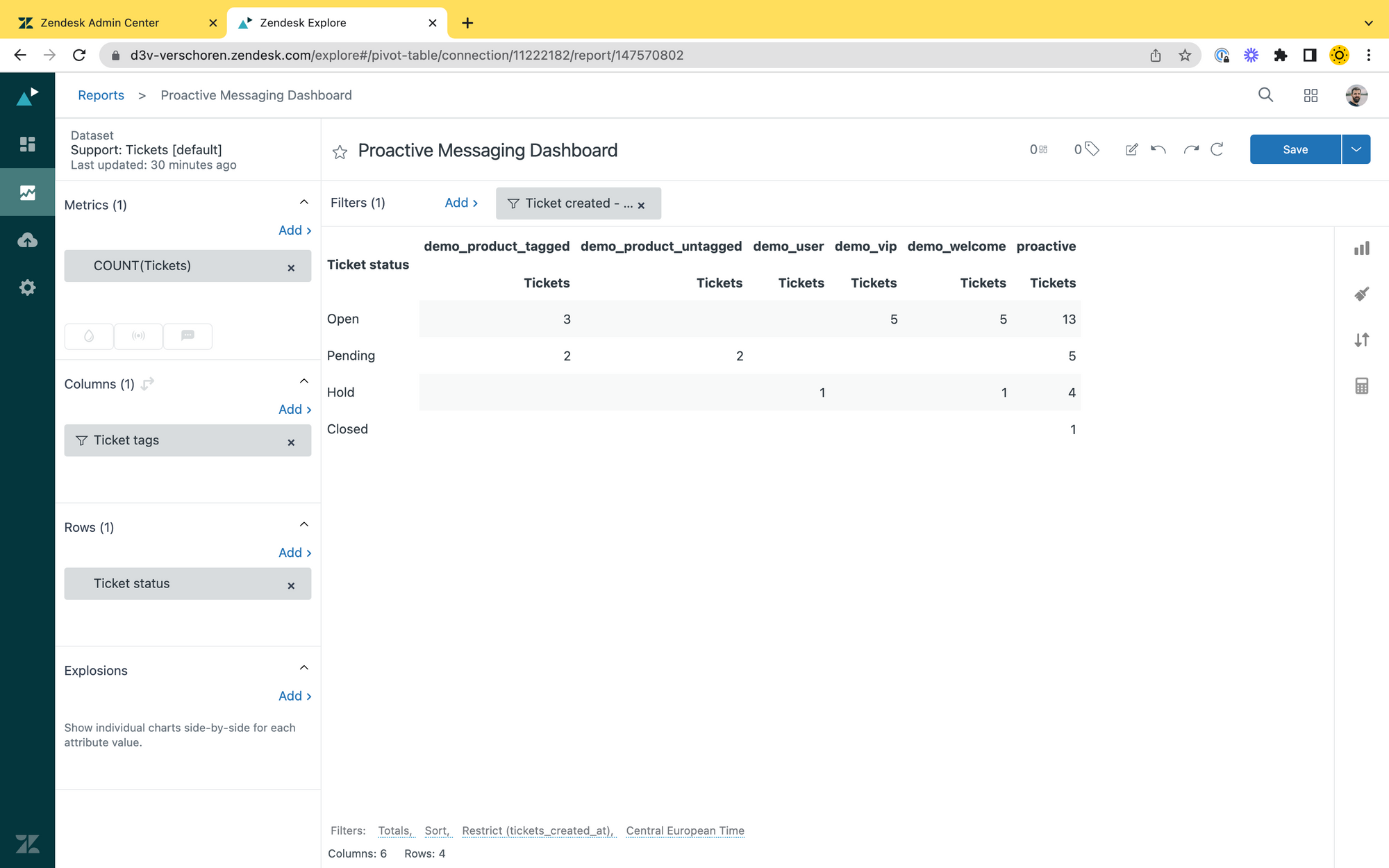 Personally I find it a bit weird that this data is not (yet) a part of Explore, but thanks to the tags used on the tickets created, you can still pull in data into Explore and get some insights in your campaigns there: