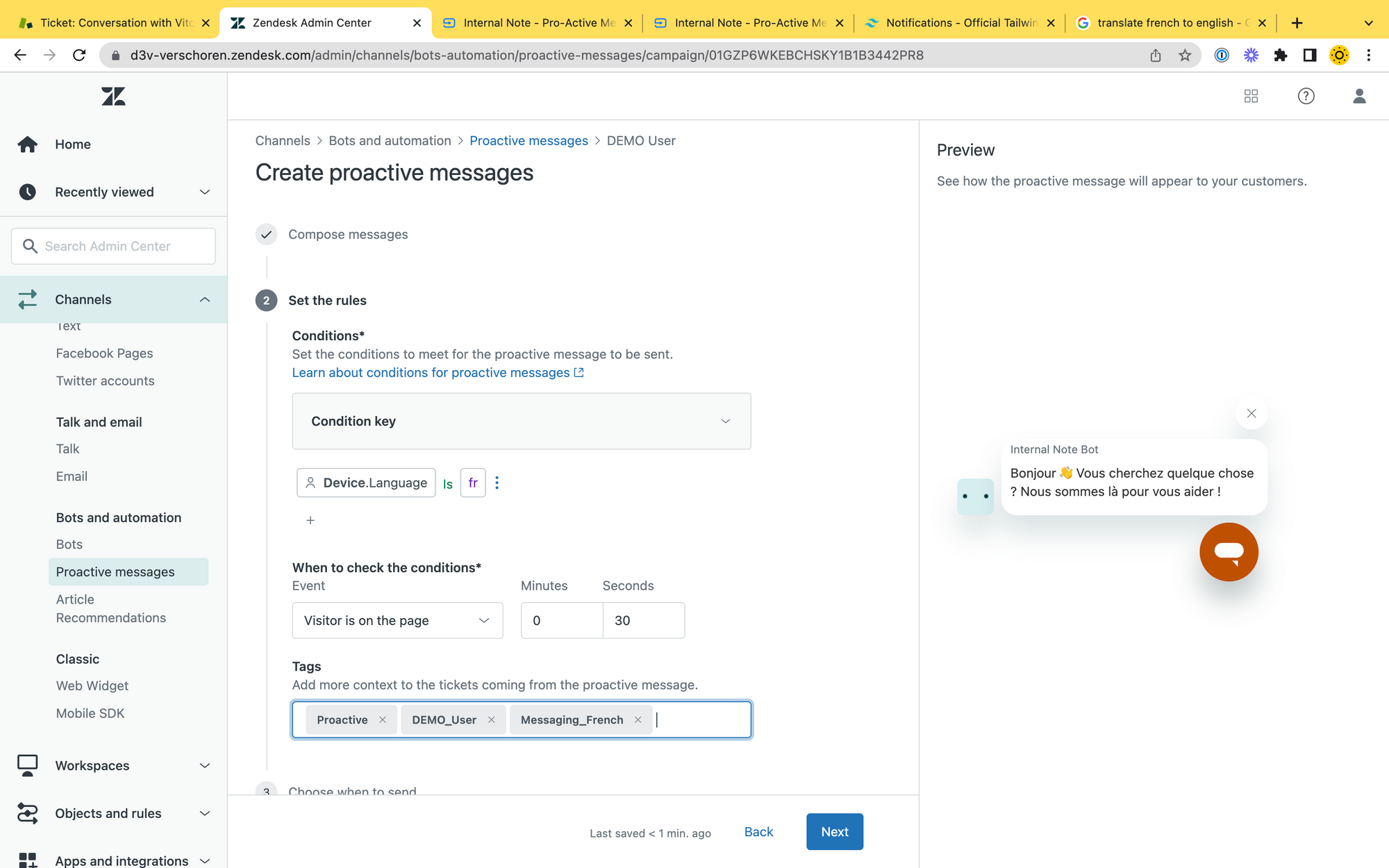In this scenario we filter on Device.Language is fr to react to pages for the french market. Note that we also add a tag Messaging_French to these conversations.