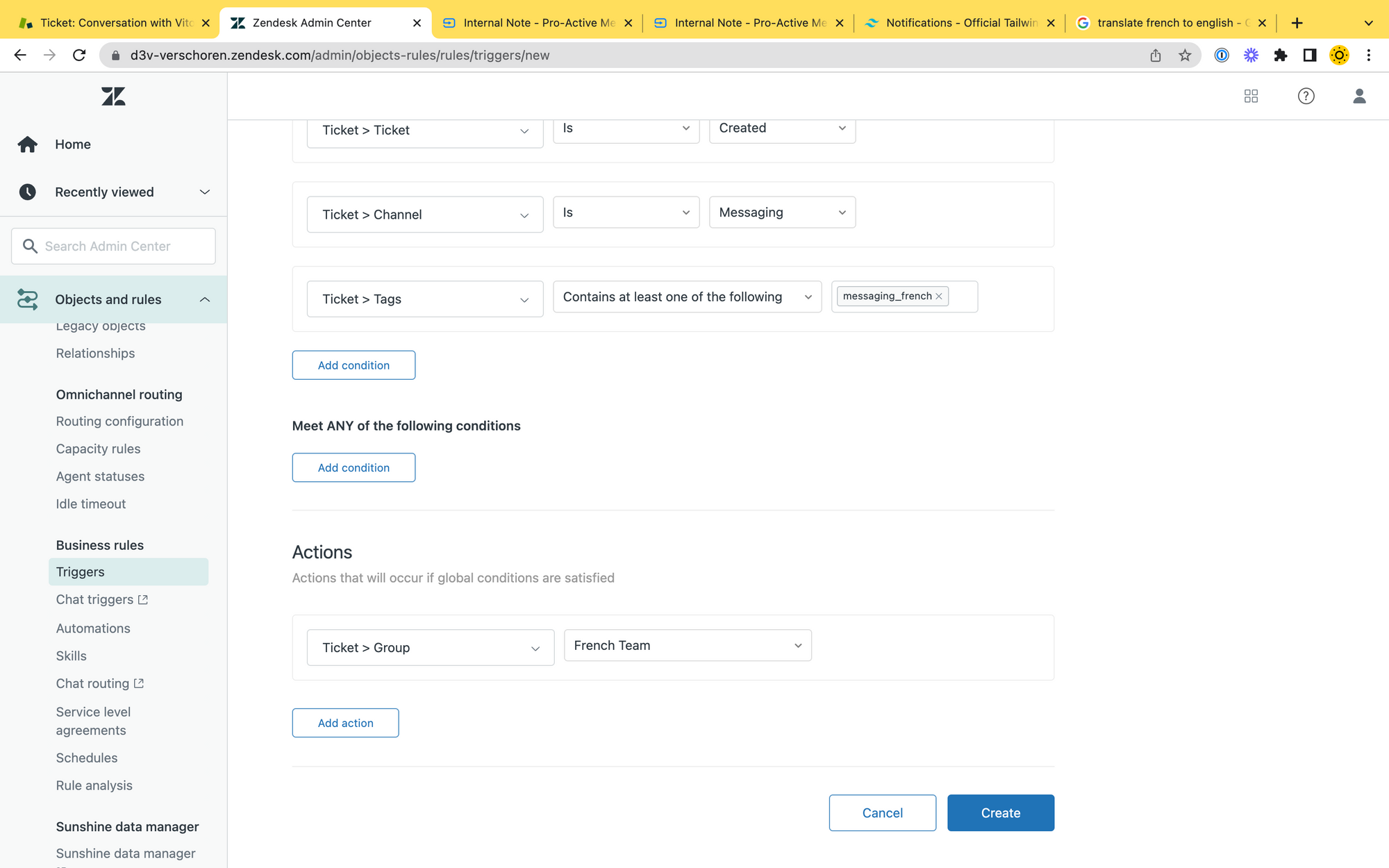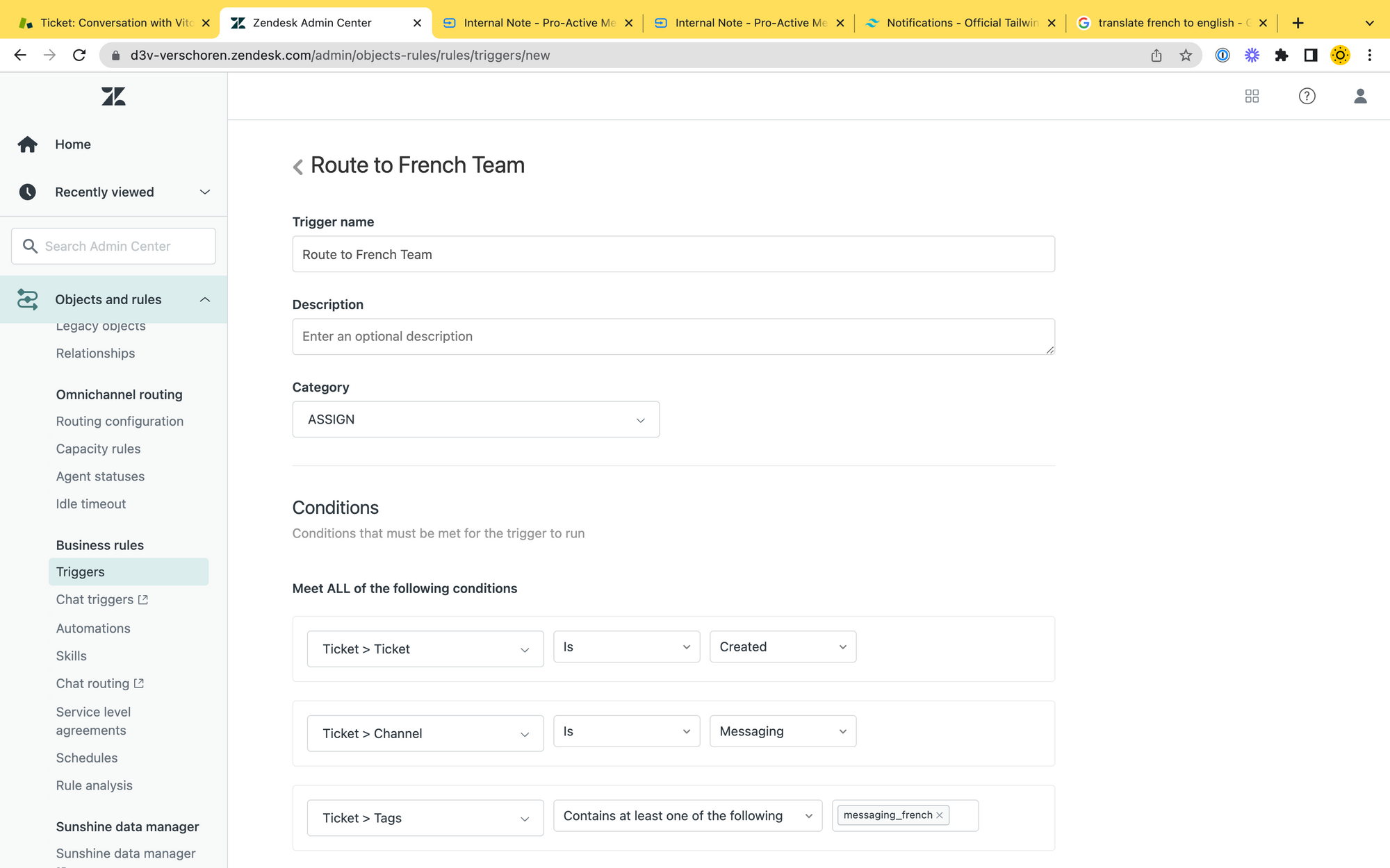 Thanks to the trigger, all conversations that start in french will now be tagged with a specific tag, and we can use a trigger to route them to a dedicated team.