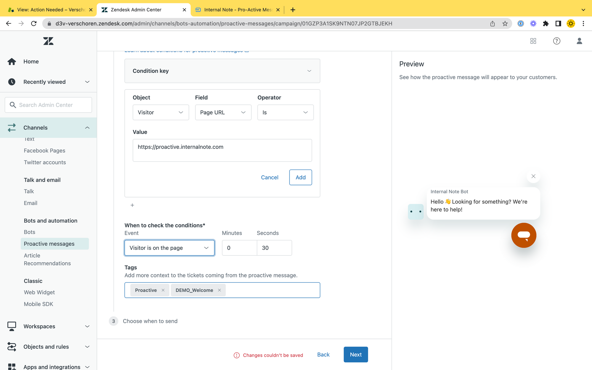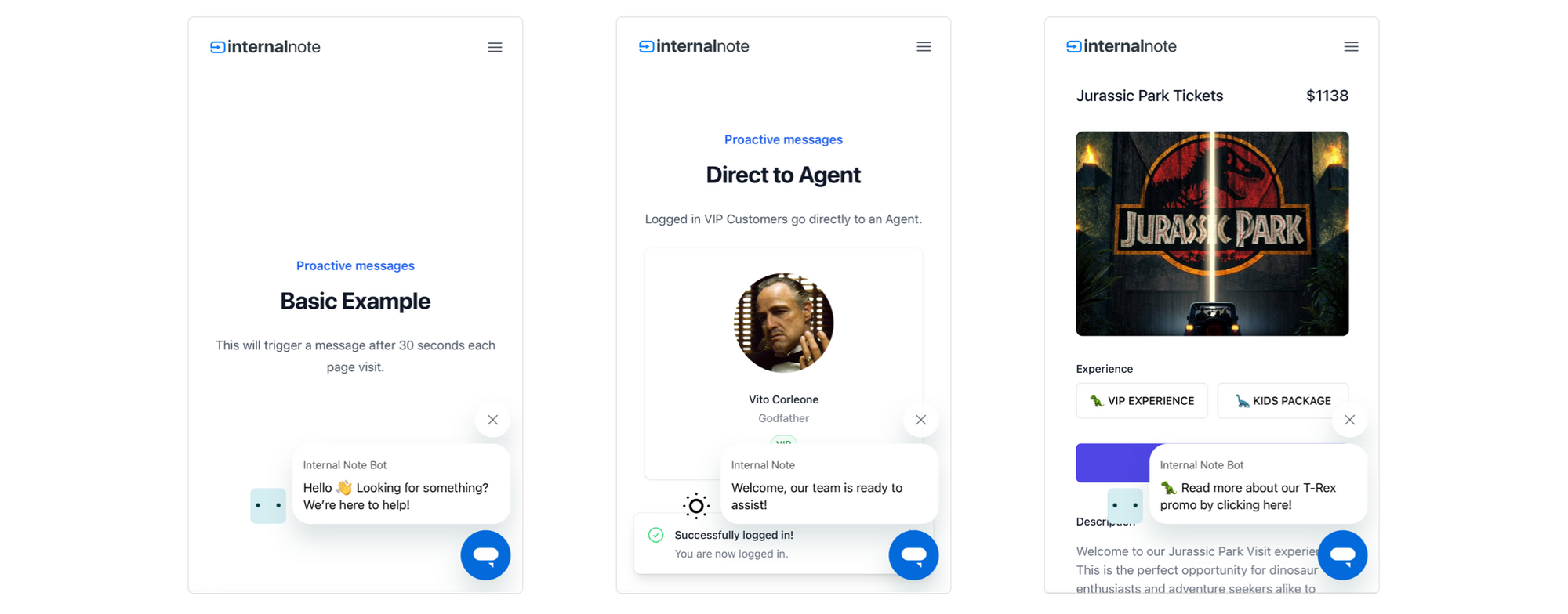 For this basic demo I chose to show the widget after 30 seconds, ignore business hours and show it once per session. You can test it out on https://demo.internalnote.com/proactive